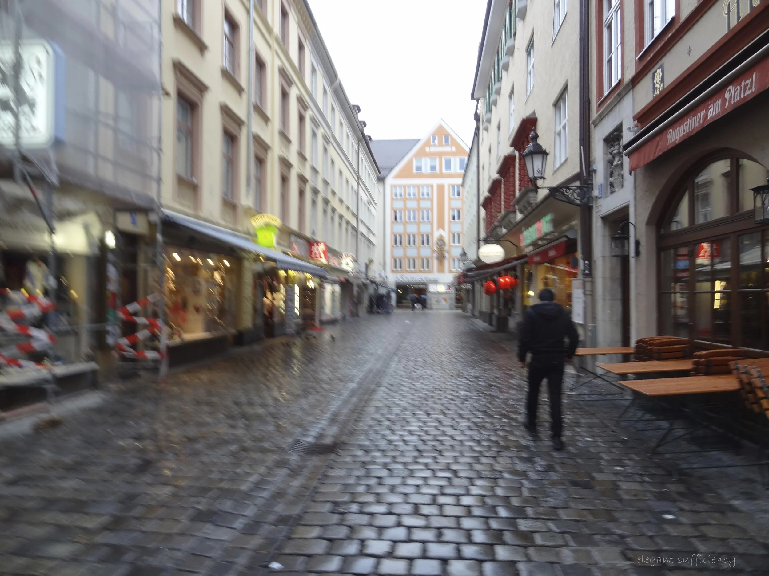 Unfortunately, though, you’re going to need an umbrella because the sunshine we had yesterday afternoon has gone and it’s a rather cold and wet Monday morning here. Never mind, we have warm coats and comfortable shoes. We’ll turn right out of the hotel and walk down here past the Hofbräuhaus, towards the market, where we might find some breakfast.