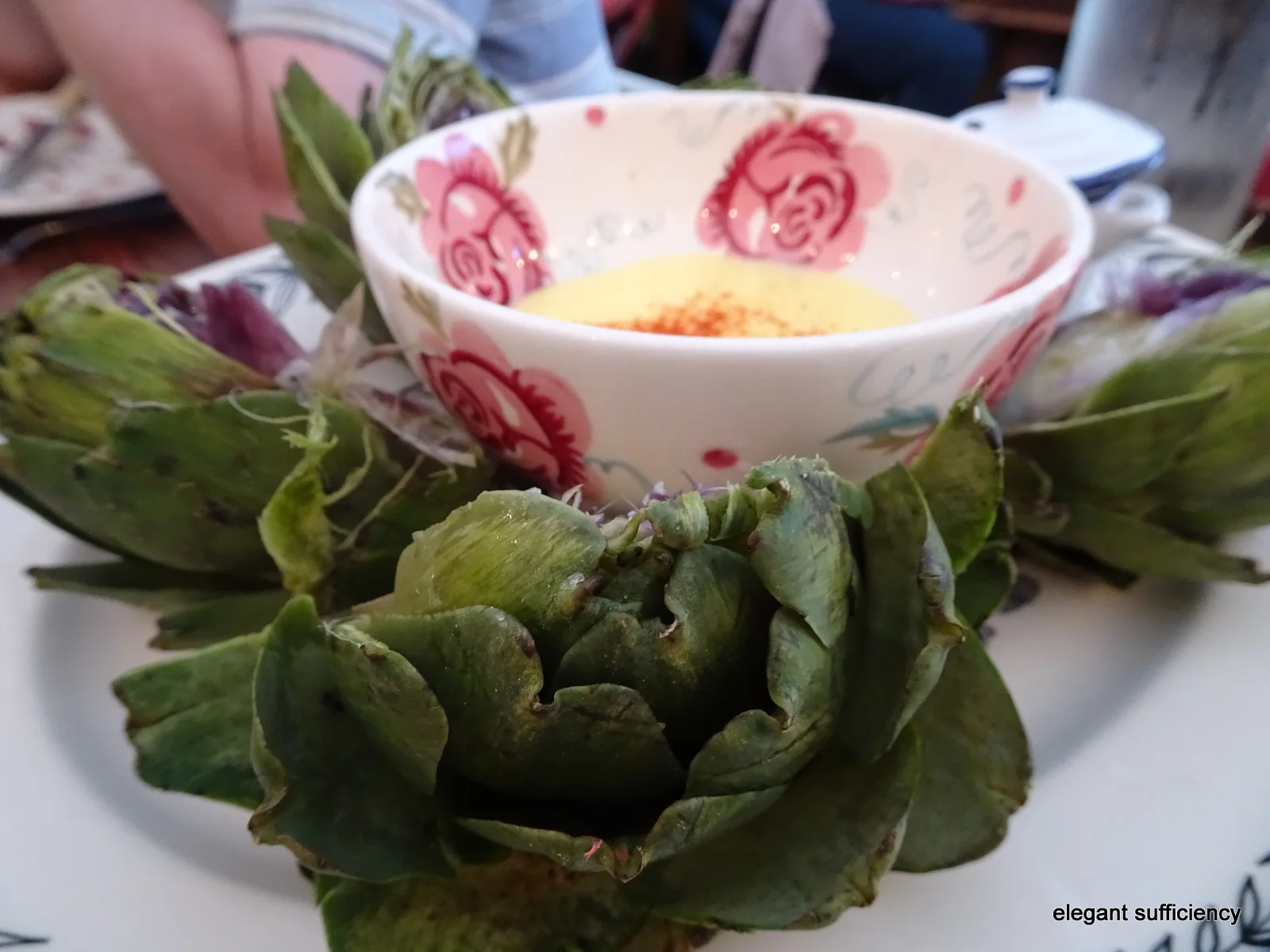 It's good food too, freshly prepared in the galley. Local ingredients served family style - a crab thermidor amuse-bouche followed by globe artichokes with hollandaise sauce. Yum.
