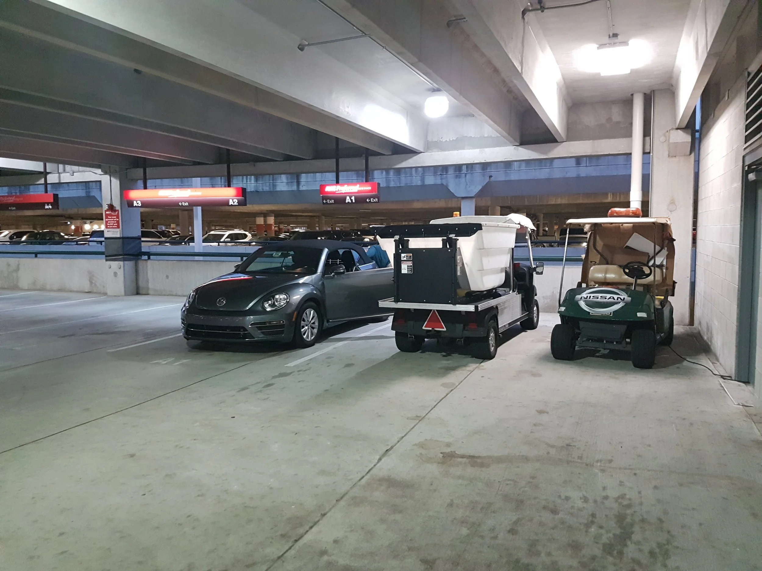 We thought the Avis clerk was having a laugh when she directed us to our vehicle in the quiet section of the car park. Thankfully it was the VW Beetle she had assigned us and not one of the adjacent golf buggies. But the Beetle had not much more than a letterbox to access the boot and it was soon clear that loading each of our suitcases was going to be impossible.