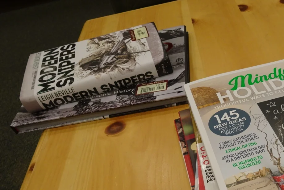 First stop was Barnes and Noble, primarily for my Hero to get a decent map of the area but I couldn’t resist gathering a few likely magazine titles to flick through before deciding which to buy. I settled down at a nearby table and began to take a look, taking note of the pile of books the chap who was there a few minutes ago had left behind.