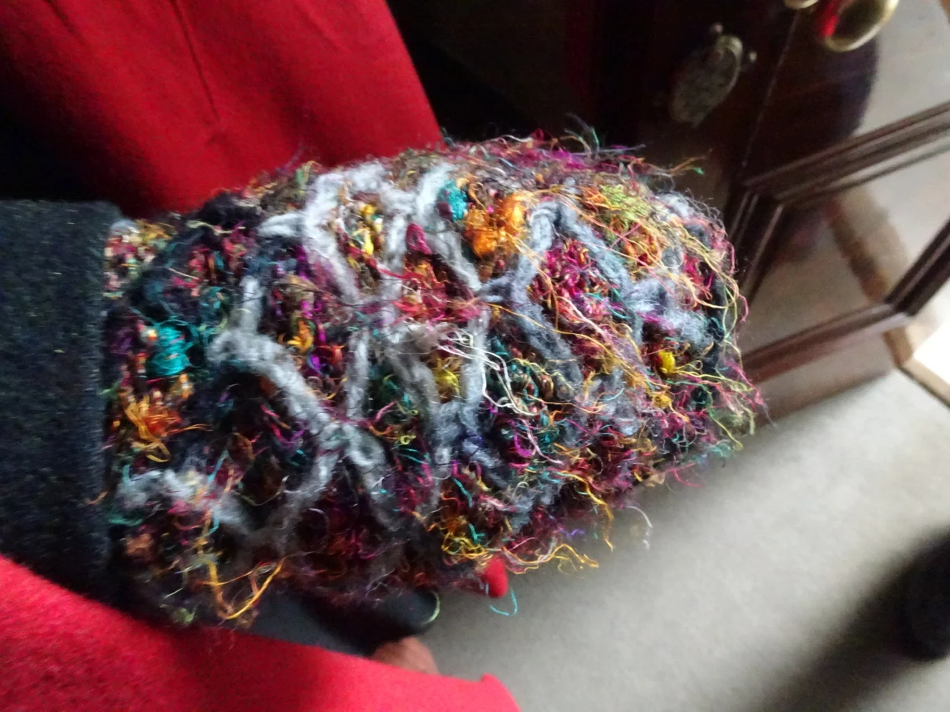 “I knew you were eyeing those mittens” said my Hero, as I snapped a picture with her (bemused) permission! I recognised the sari waste immediately (I think I have some at home!) but couldn’t recognise how it had been constructed into the mitten fabric, sadly.