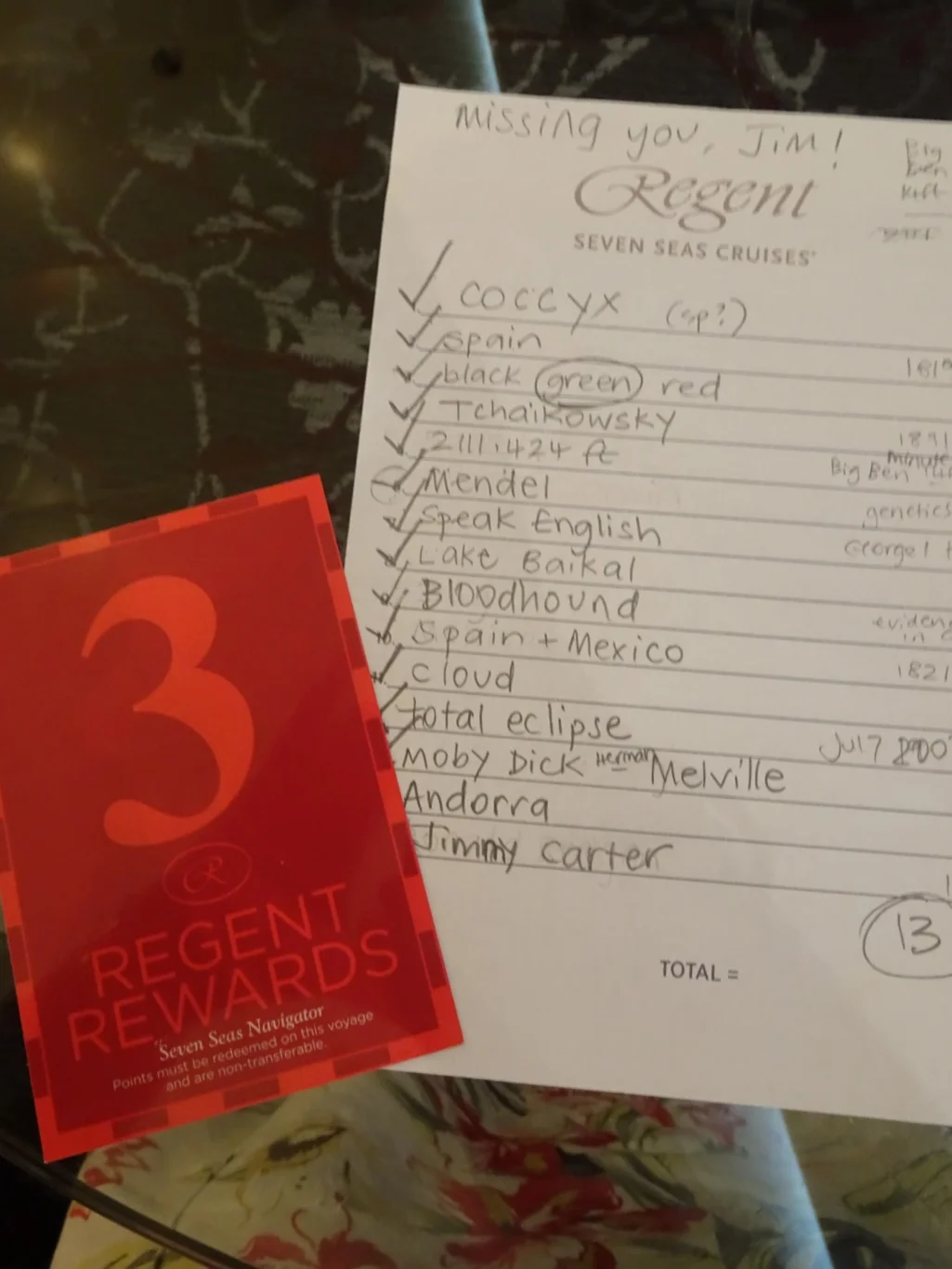 So each day when we begin our trivia sheet by putting our name at the top, I write "missing you Jim" in tribute to the chap who joined our team on one of our first cruises, who had a wonderful knowledge of sport - a subject about which we are woefully ignorant. As you can see, we did rather well yesterday though, even we should have got one of the two wrong answers correct (my hero overthought it and didn't just go with his instinct). The other one was about an event on the 7 July 2007 watched by millions of people on TV worldwide. Since that's my hero's birthday, we felt we should know what it was but we didn't and simply guessed a total exclipse. The answer was Michael Jackson's funeral!