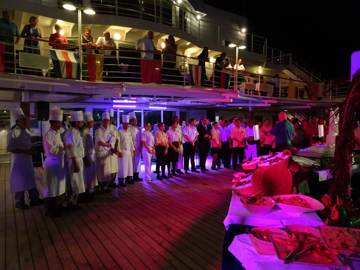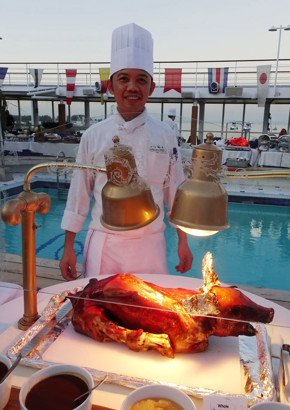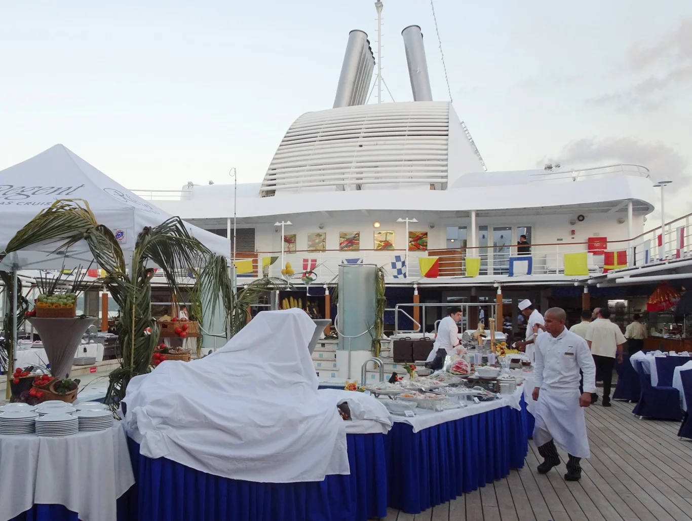 When we returned in the afternoon, everything was looking rather different. Tables had been set up around the pool and all the foundations were in place already. Galley staff had been busy setting up their areas and restaurant staff had arranged all the tableware for the event.