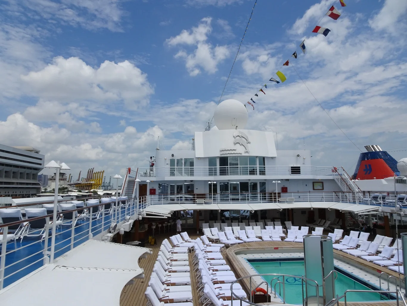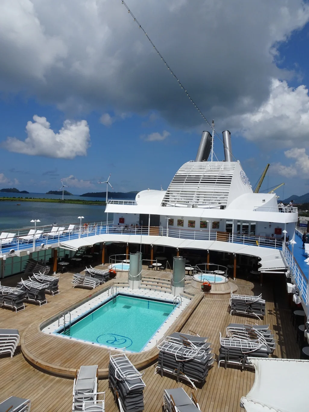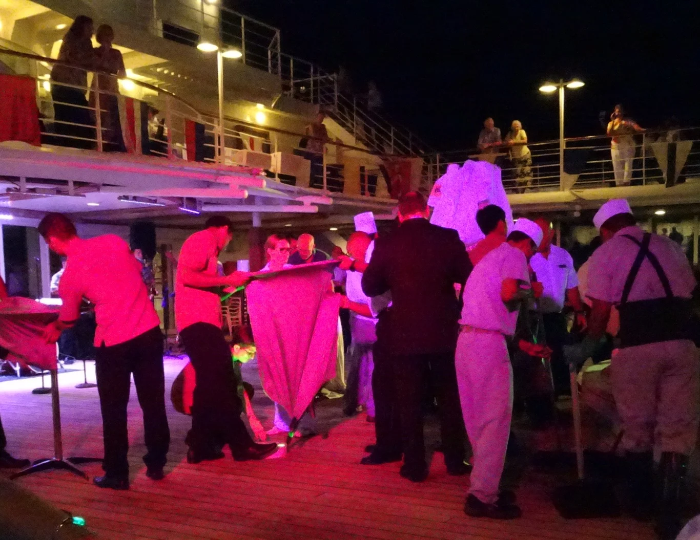 When we returned in the afternoon, everything was looking rather different. Tables had been set up around the pool and all the foundations were in place already. Galley staff had been busy setting up their areas and restaurant staff had arranged all the tableware for the event.