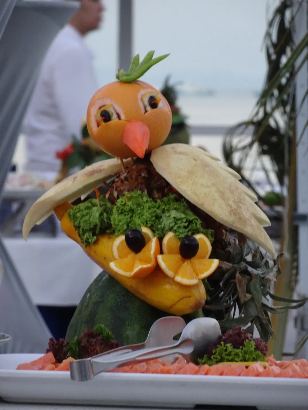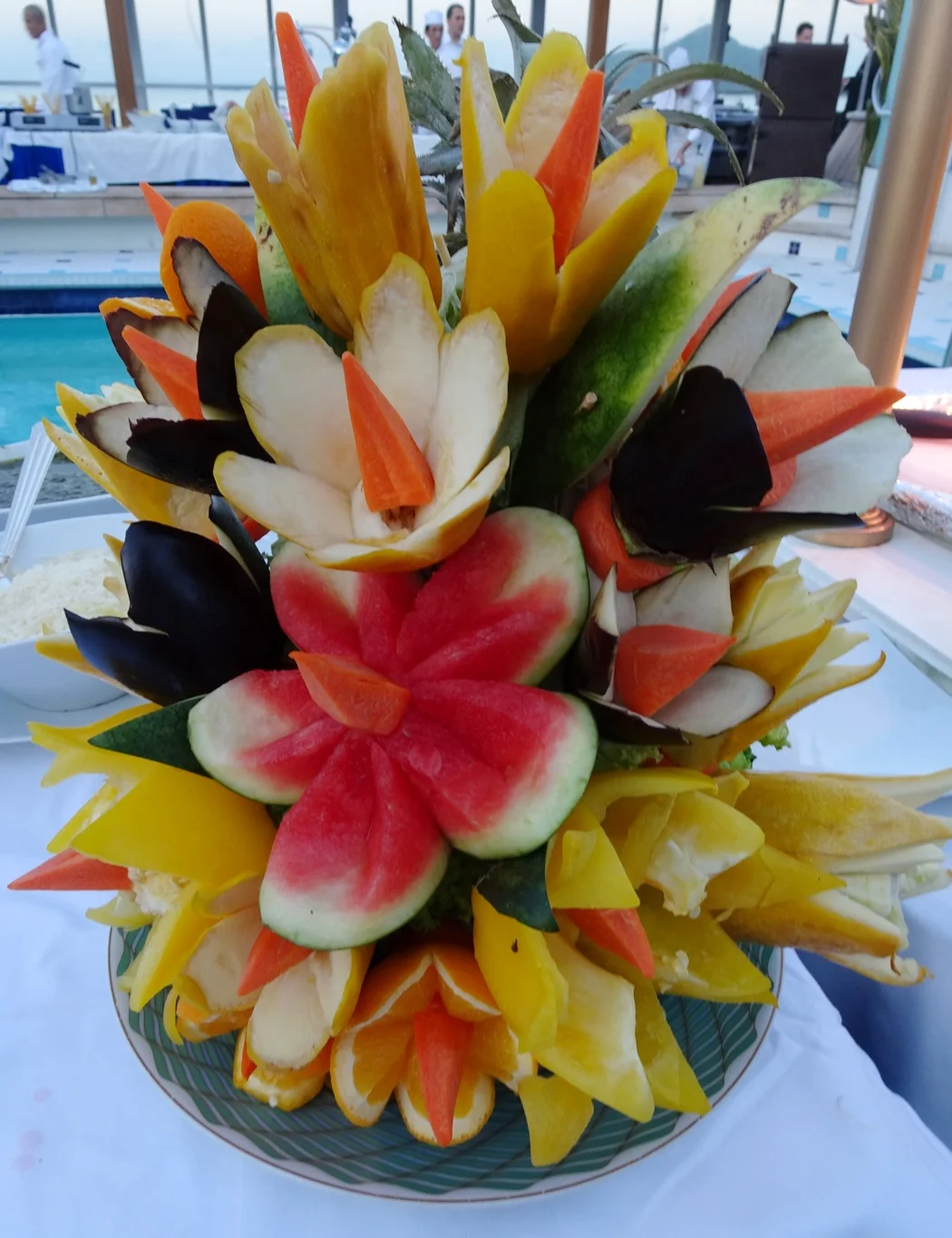 We decided to meet our friends for drinks at the pool bar that evening, thinking that we might find a sweet spot for dinner, with a good view of the "stage". I took a look around the central area and admired the stunning work that was already in place. Someone in the galley had been having fun putting their fruit carving skills to great use - how clever is this?
