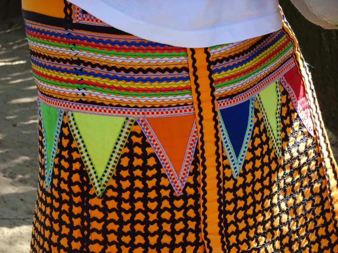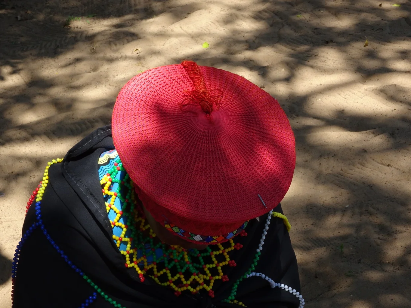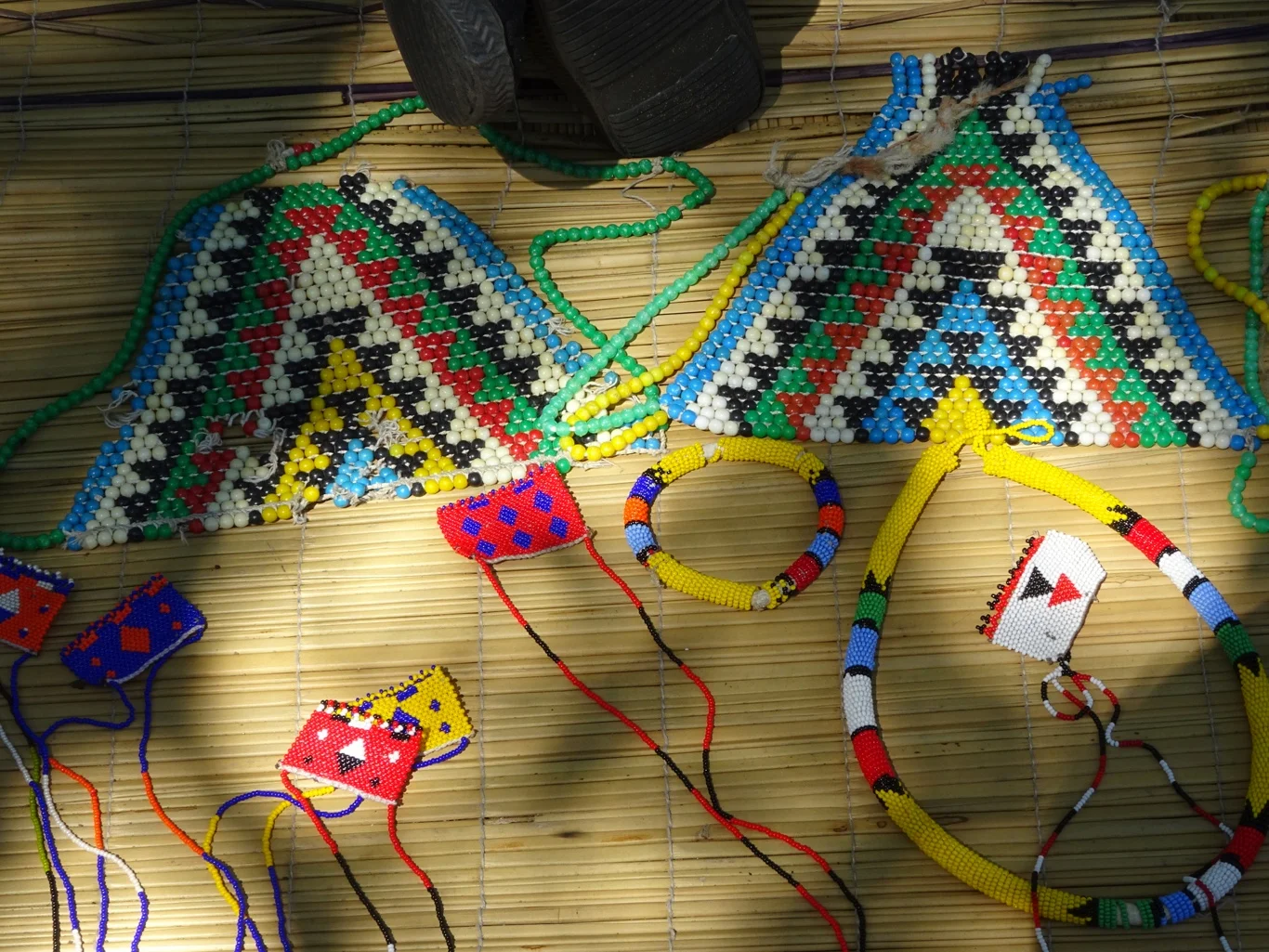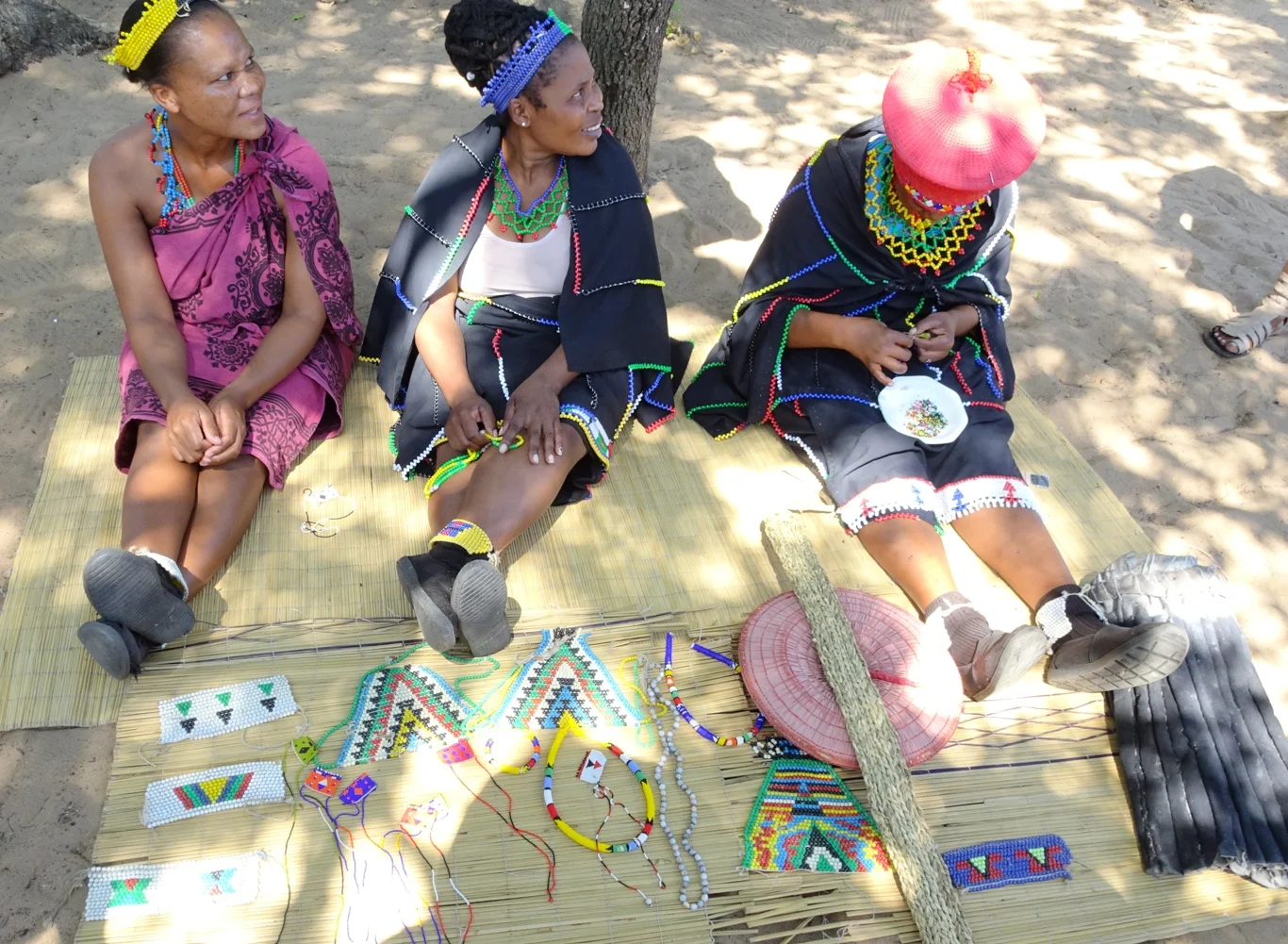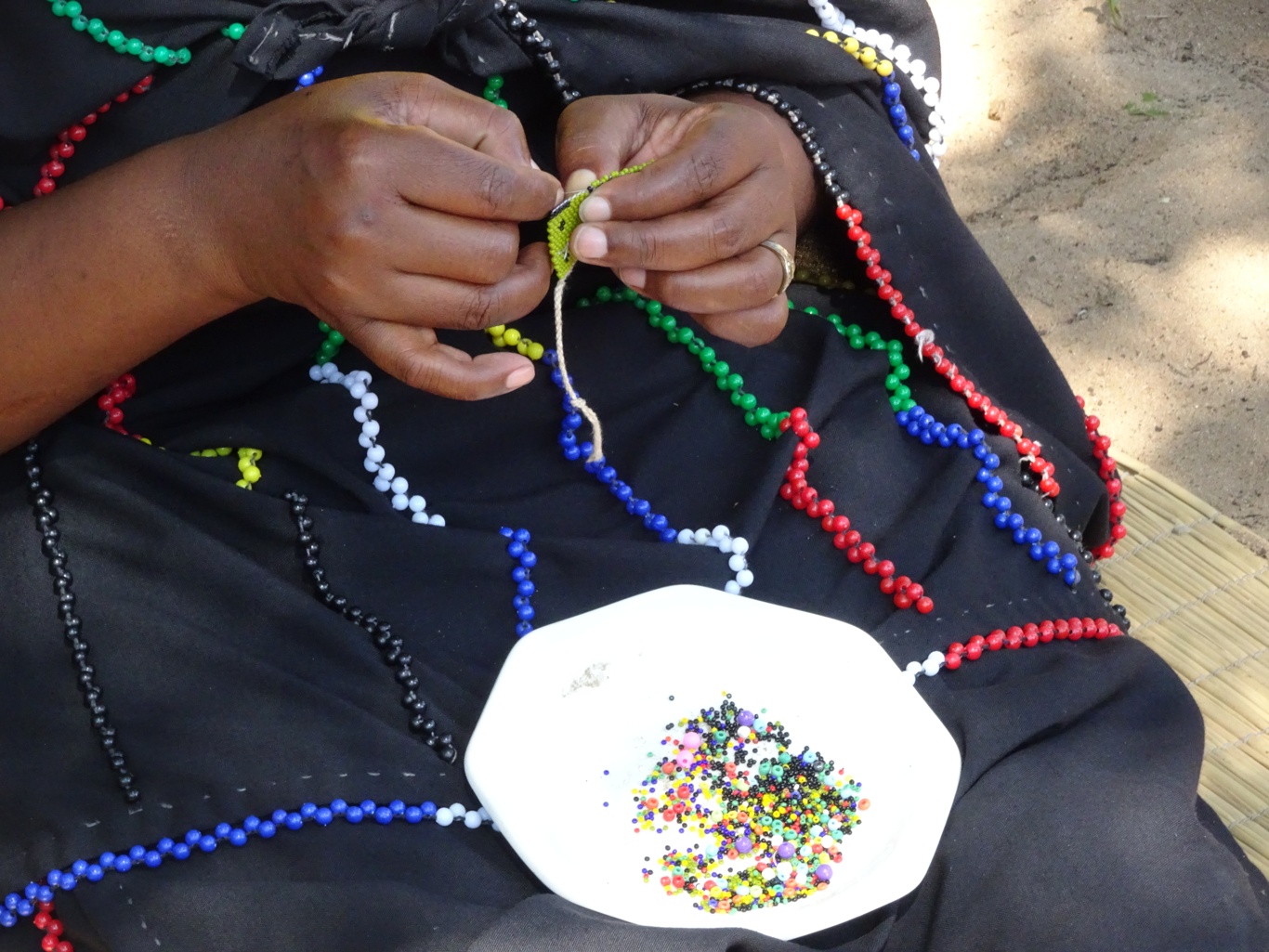 As she worked I wondered where they got the glass beads from, and as if by telepathy, Bongy explained it all. In earlier days, the women would use dried beans to thread together, first naturally coloured and then dyed or painted bright colours. As they found the colour washed or wore off over time, they were glad when the Portuguese introduced them to the tiny glass beads which they use today. I suppose it didn't really answer my question about where they buy these things, but at least I got a bit of background info!