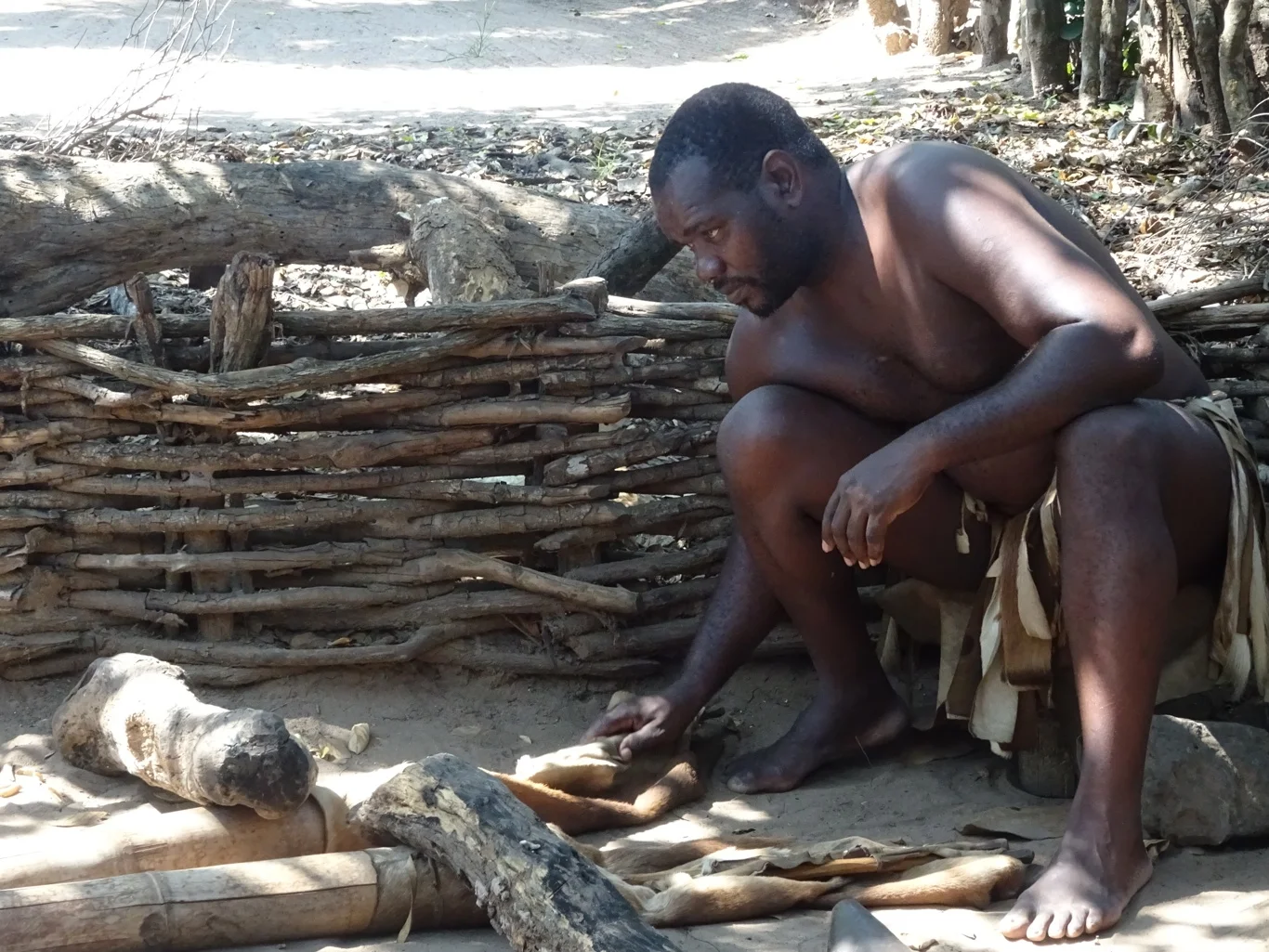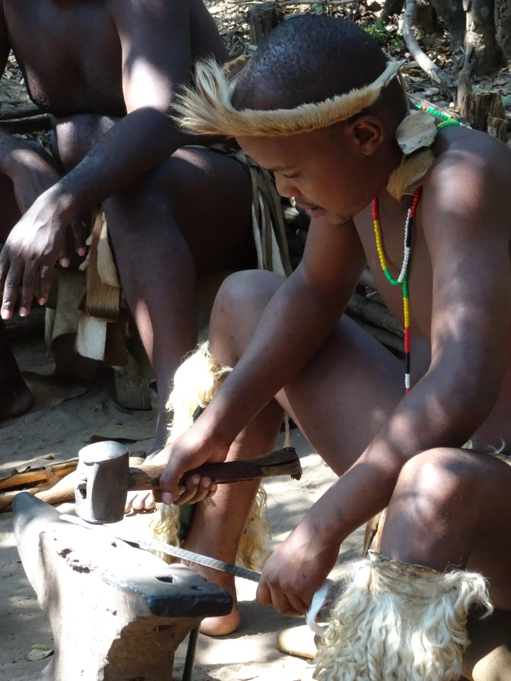 We began with the swordmaking. This chap was using a couple of animal skin bellows to fan the flames of a makeshift furnace. We'd learned about these Zulu assegai during on board lectures about the Zlu wars during the last couple of days.