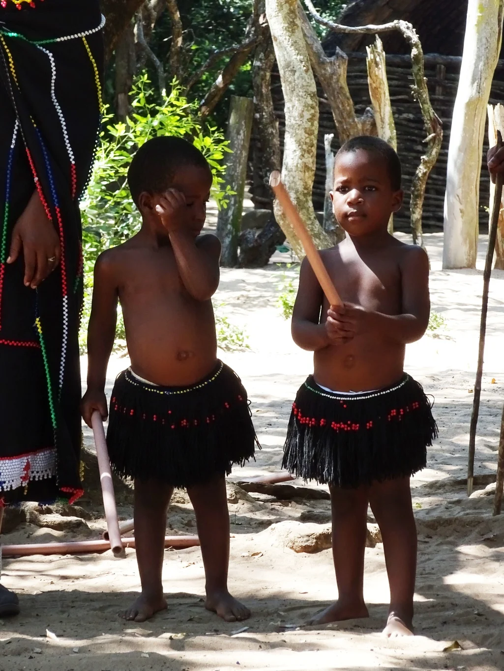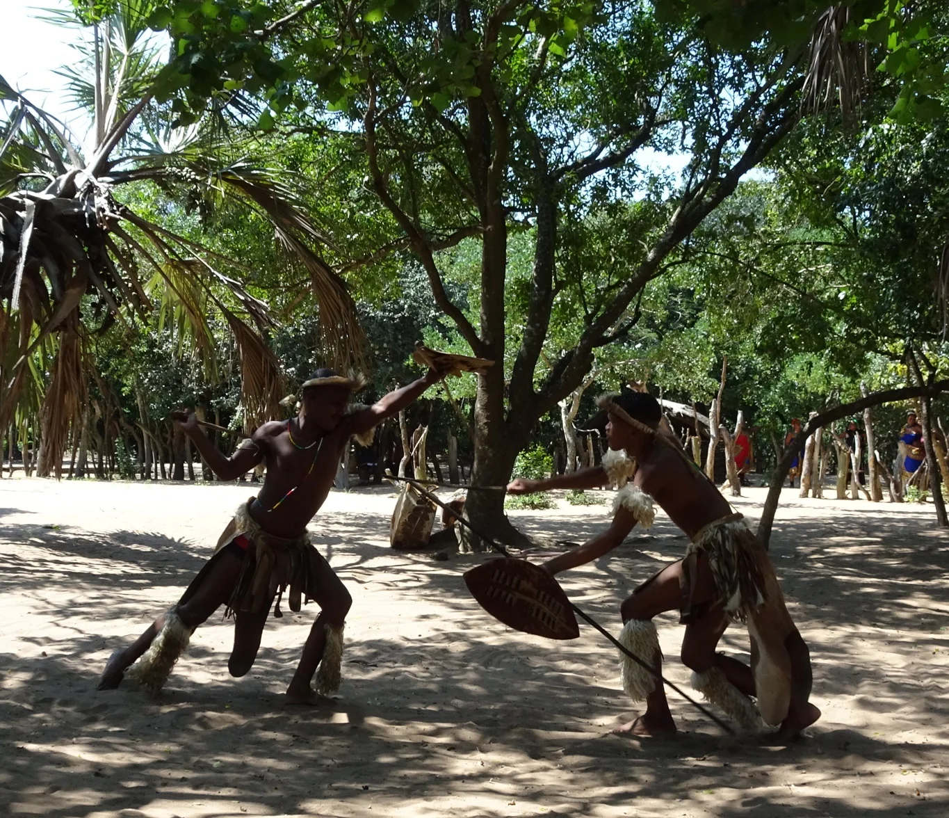 That was the end of the crafts part though, because now we were to sit and watch some dancing and play-fighting with sticks. There was a bit of a commotion as the ladies appeared, chanting and ululating and the men ran in with spears, sticks and what looked like feather dusters (but surely were not!)
