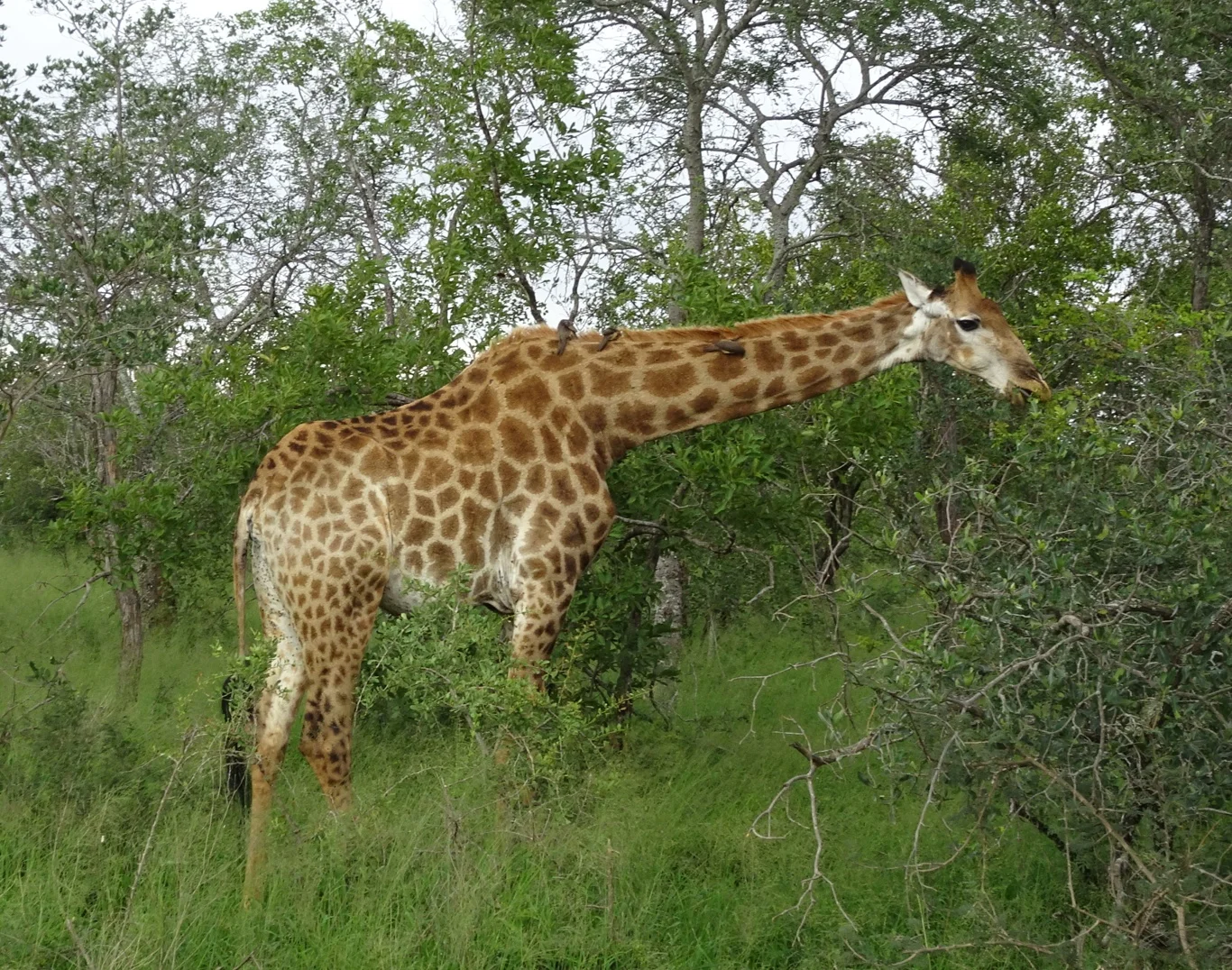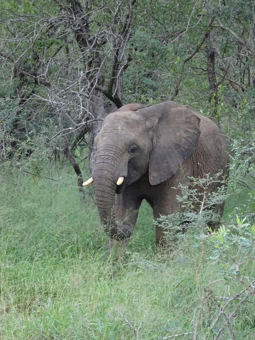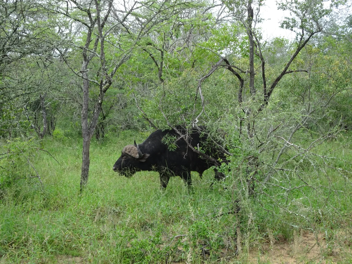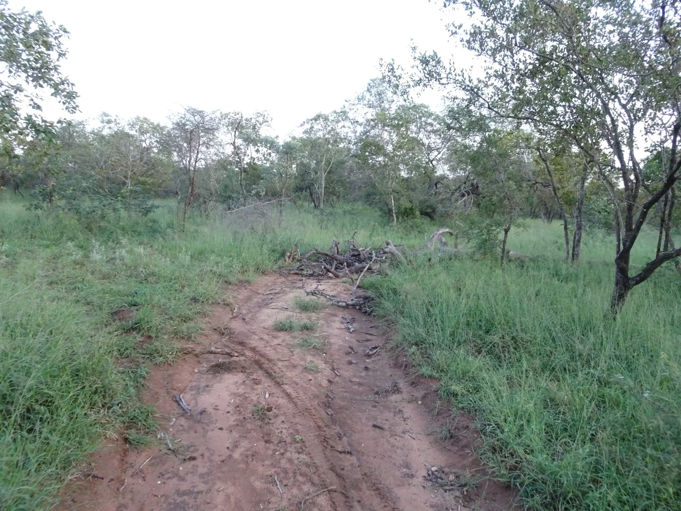 We followed the smallest of tracks, sometimes having to go around roadblocks. This was an interesting and rather more remote part of the park, witih more small trees and shrubs, some of which had been broken off as if something had trampled through. Ooooh! Occasionally, Carlos would point out a path which had been trodden through grass, but so far, there was no sight of rhino or anything else for that matter.