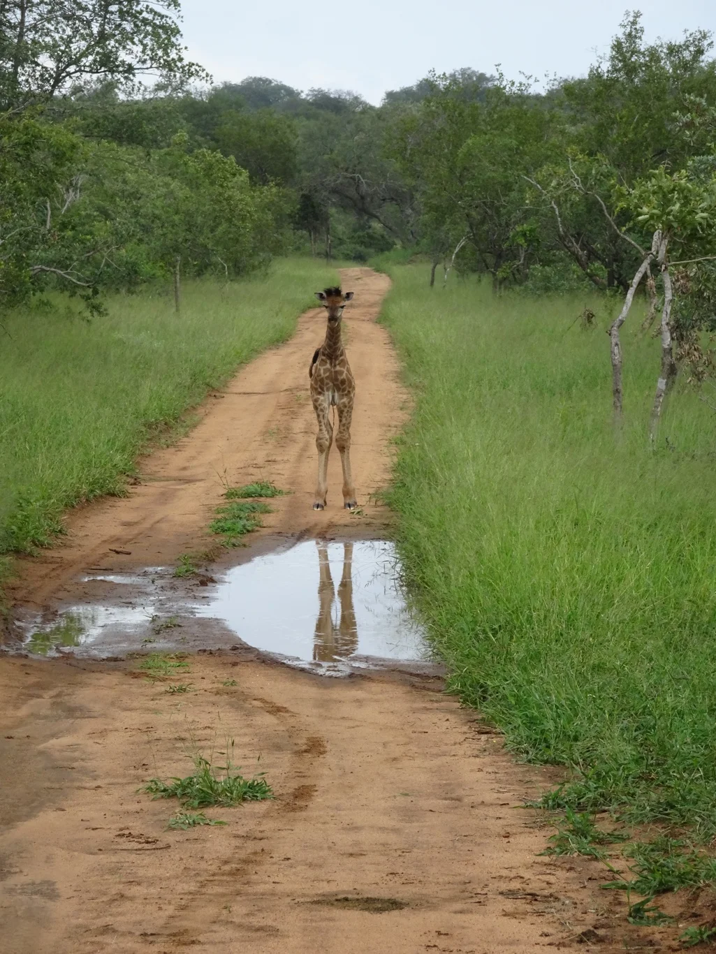 The little giraffe stood and stared at us - possibly the first humans she's seen, though as we were sitting in a large vehicle, she wouldn't recognise us as such. By chance she looked down and caught sight of herself in the puddle of water which distracted her for a while, too.