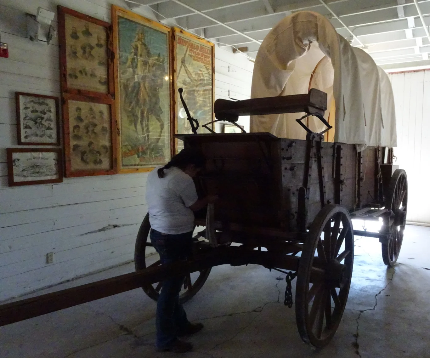 Inside was a collection of this and that, including an Oregon trail wagon being cleaned by a young volunteer.
