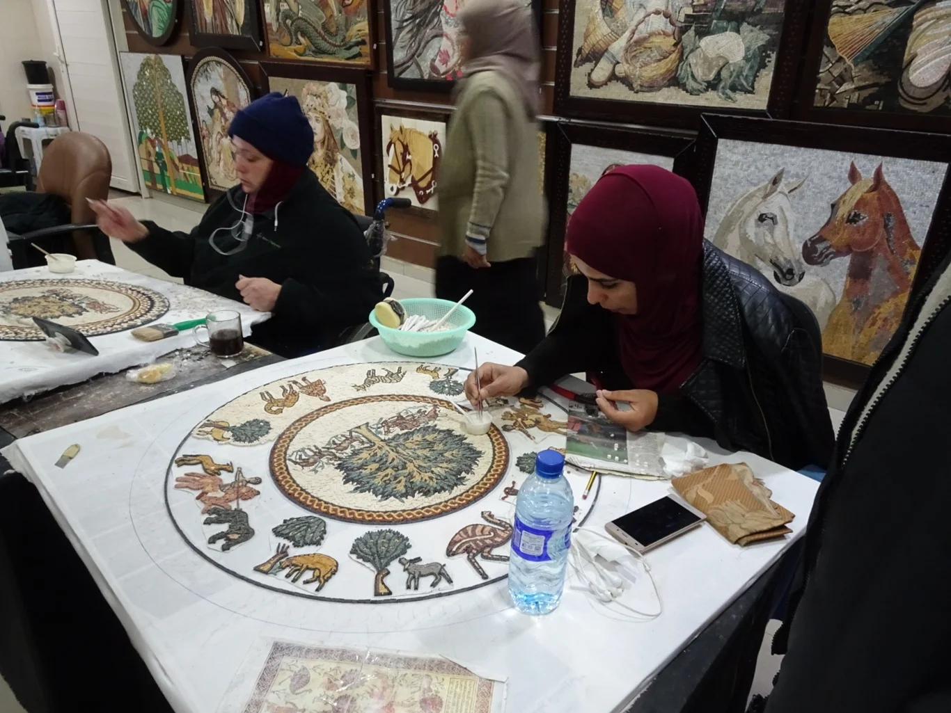 From the calm, quiet design of the Memorial at Mount Nebo, we travelled just a few miles in distance but rather further in terms of taste and culture to the Mosaic workshop down the road.