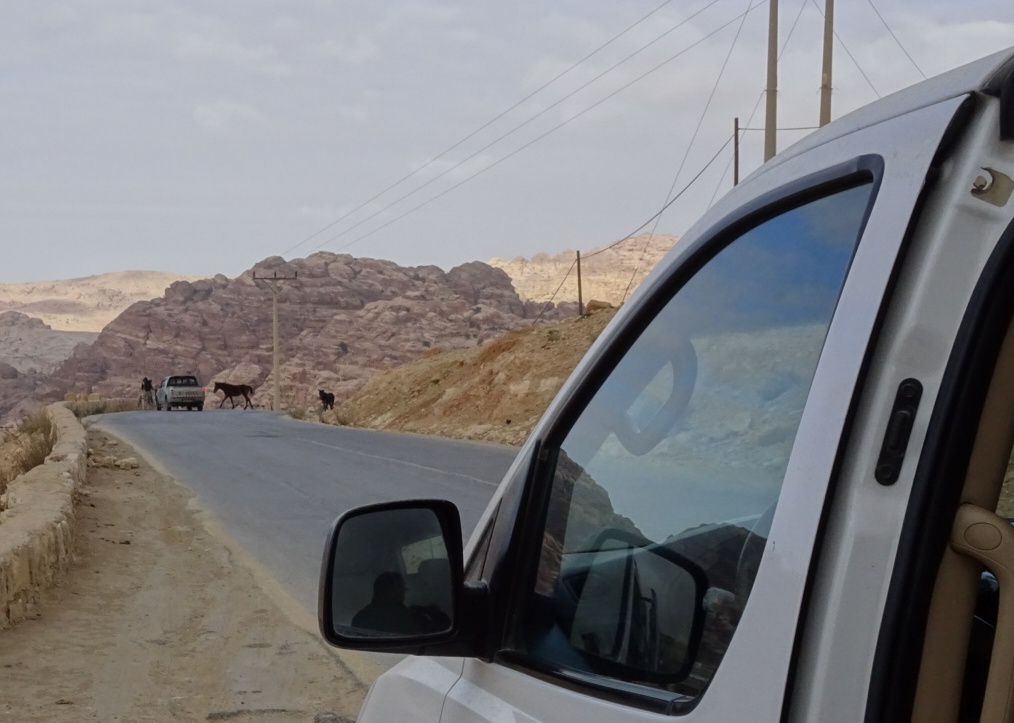 We were driving to Little Petra first of all, high above where we’d been yesterday, catching tantalising glimpses of the facades from time to time. We made a short stop for us to jump out and take photos, but as is the way here, there’s often something else going on nearby.