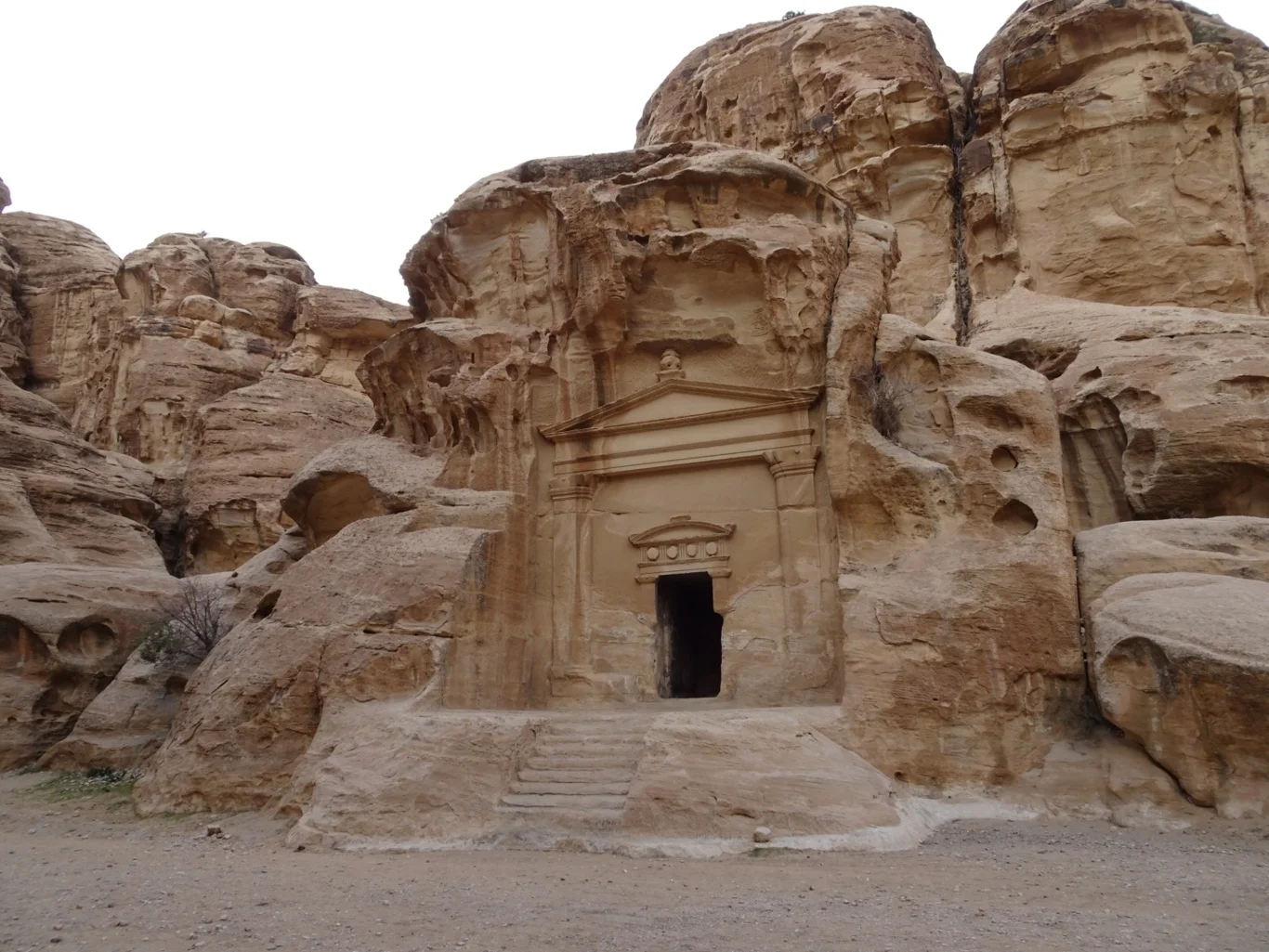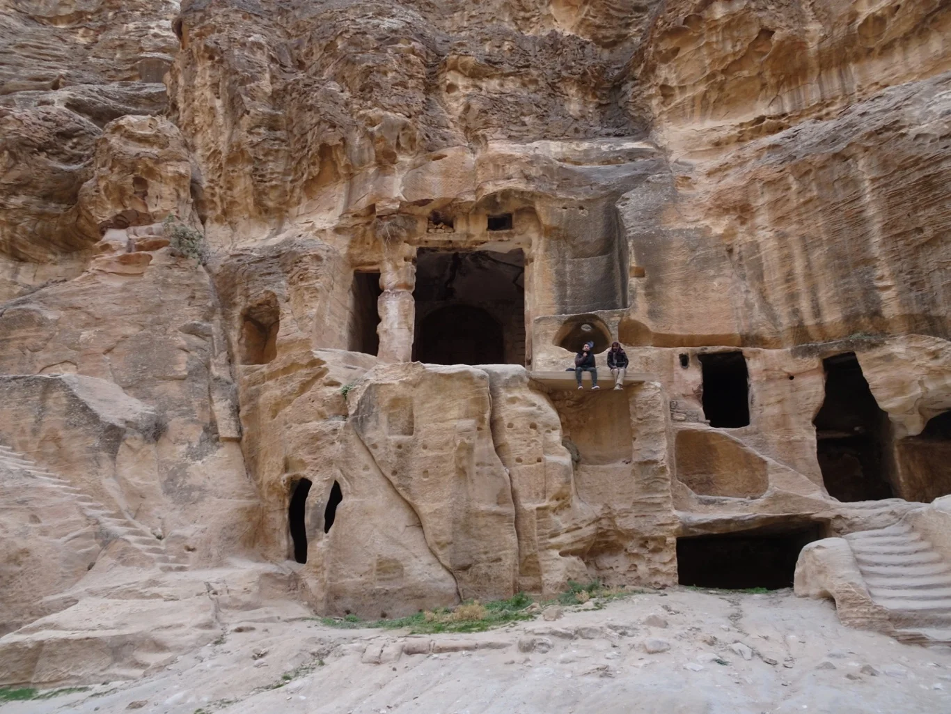 We followed Mo as he took the pathway to the left of the previous picture, though a narrow siq, much the same as we’d walked yesterday, though on a rather smaller scale. Soon, we were in front of this triclinium, looking inside and being amazed by the structure, which was neat, straight right angles.