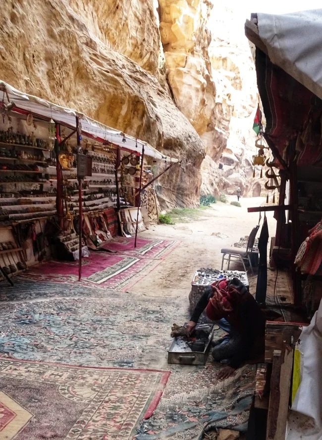 There was just the one Bedouin chap sitting by his small fire at the head of the siq, smoking and chatting on his mobile phone. In common with most of the traders here in Jordan, he didn’t seem very anxious to sell anything to those passing by - it’s great being somewhere like this and not feel pestered!