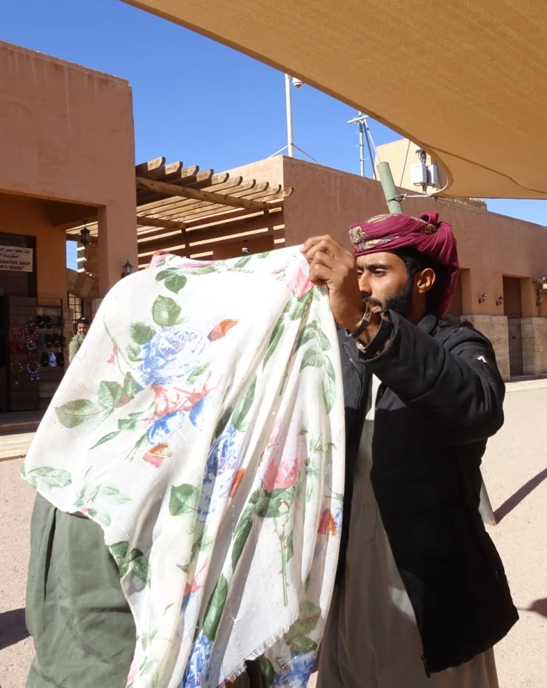 Whilst Amy and I were in the Ladies’, the male attendant had offered to tie Amy’s scarf Bedouin-style for her, but as soon as Saleh saw it, he wanted to do better! (he did)