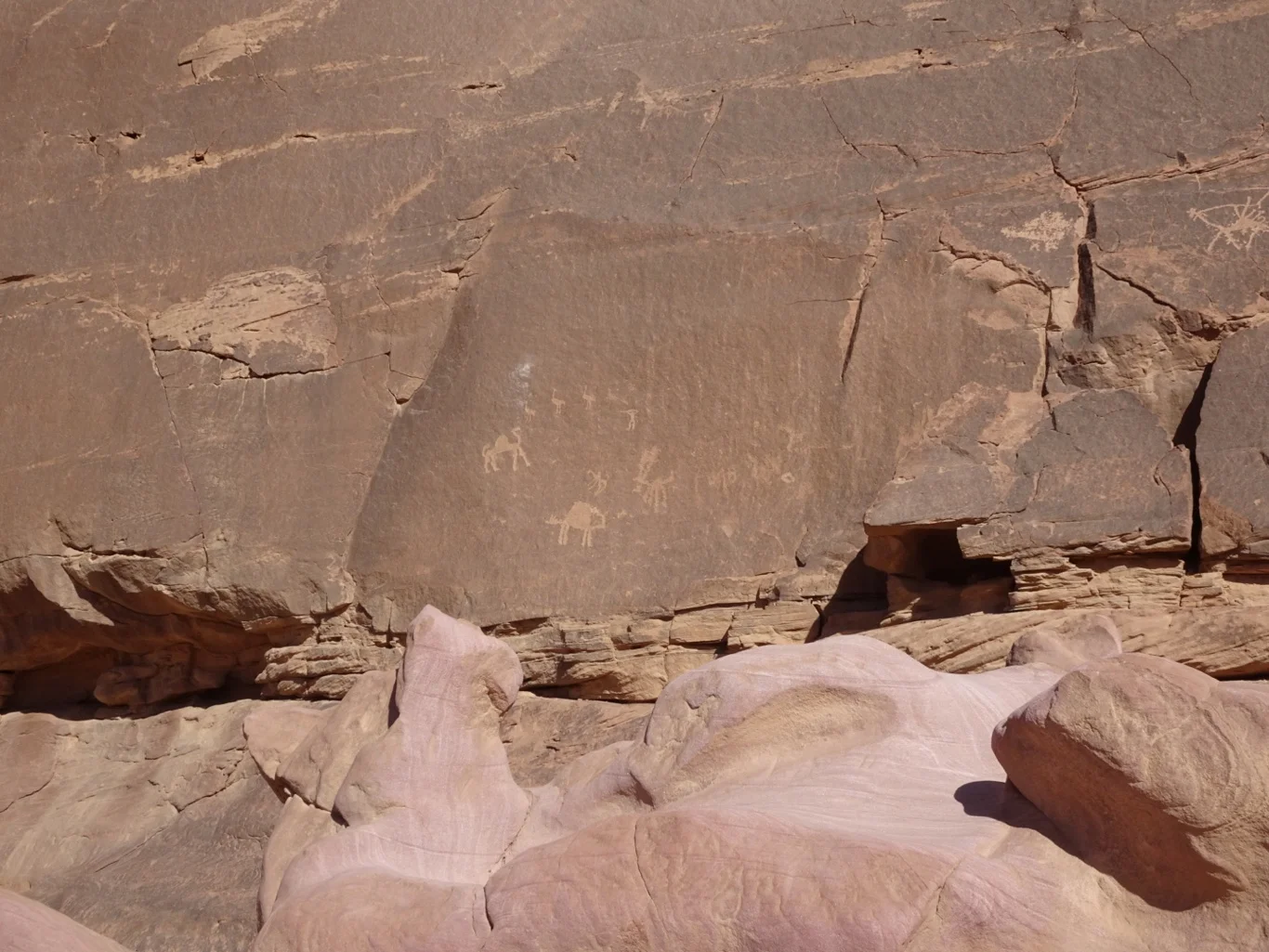Our next stop was to take a closer look at some petroglyphs, though the group of noisy camels standing nearby were doing their best to attract our attention.
