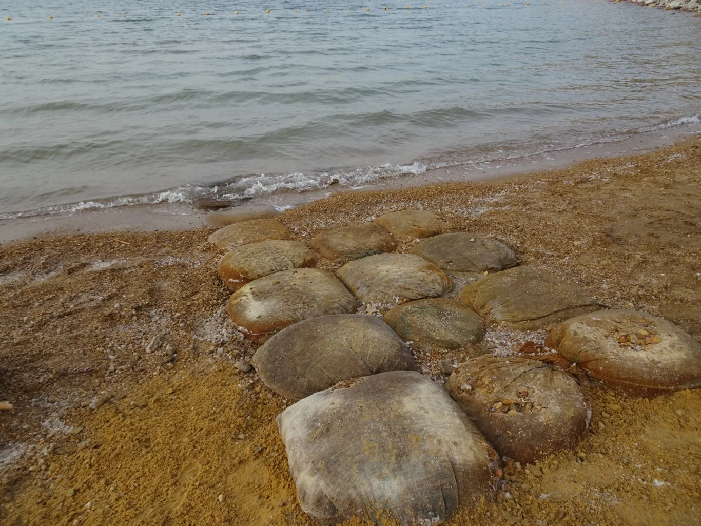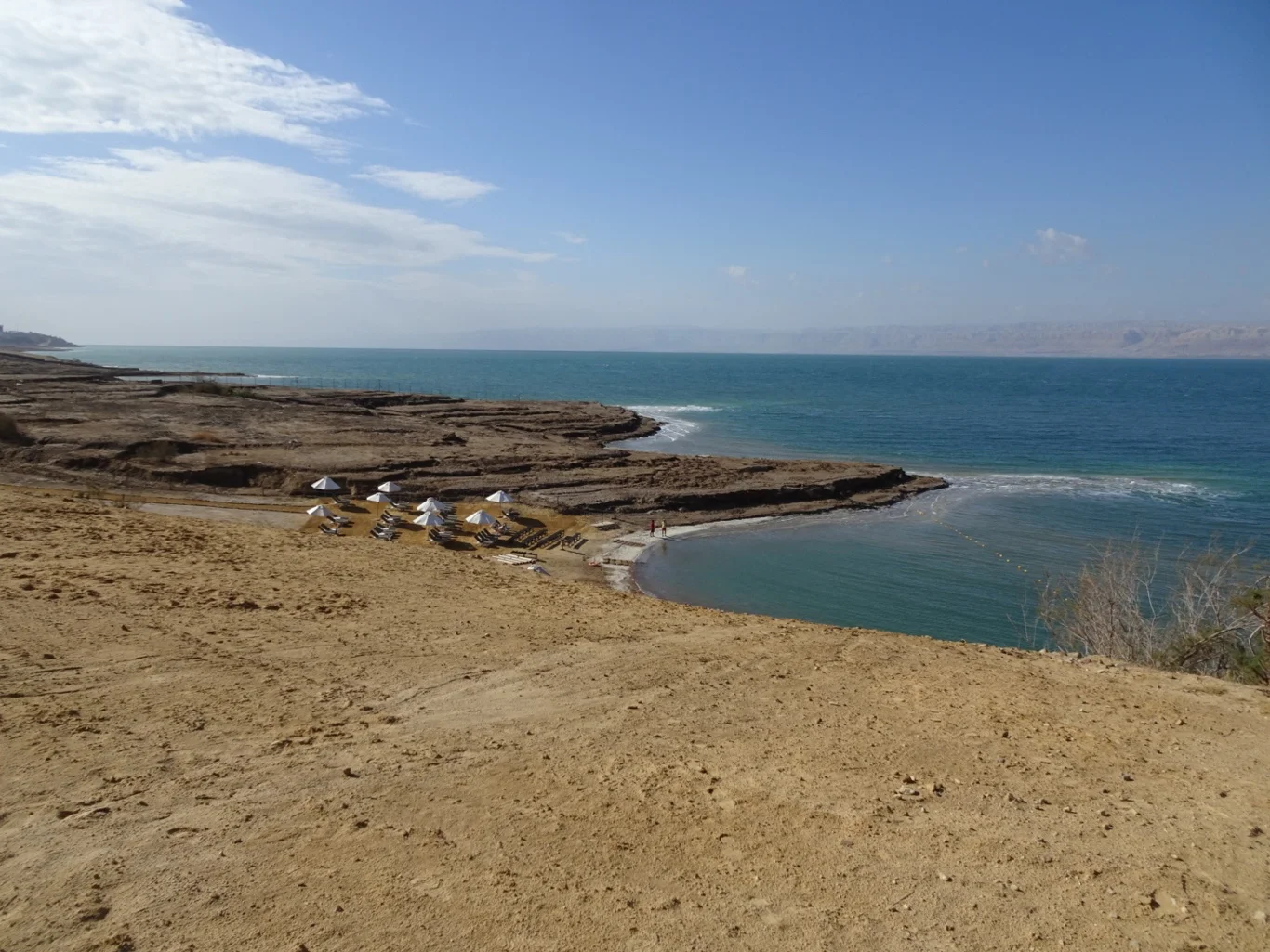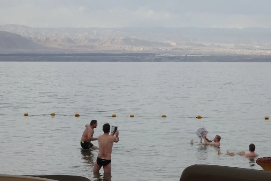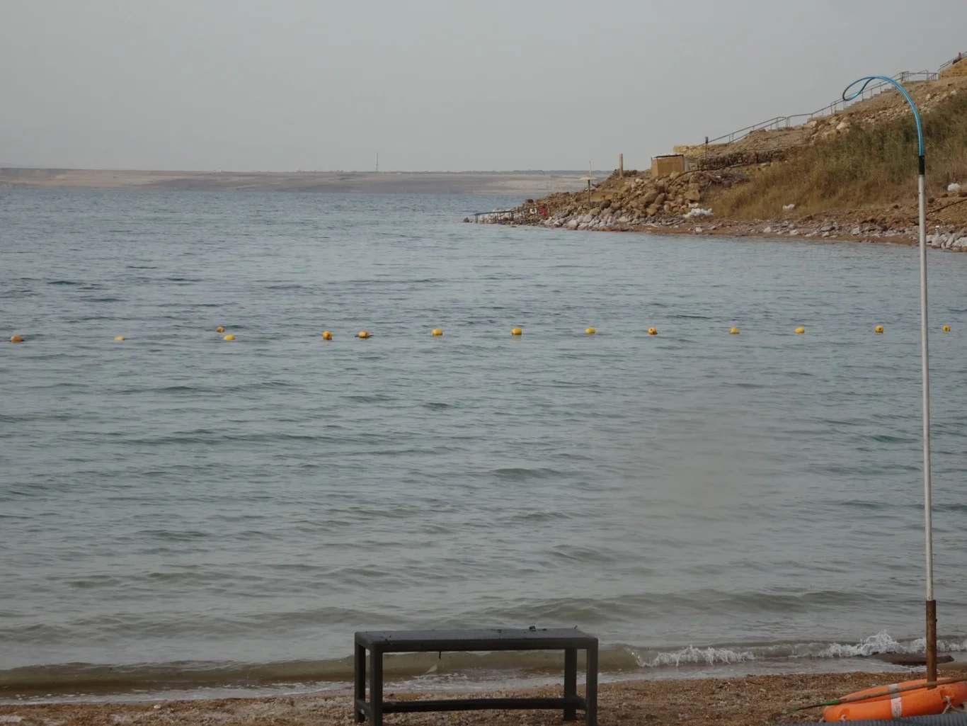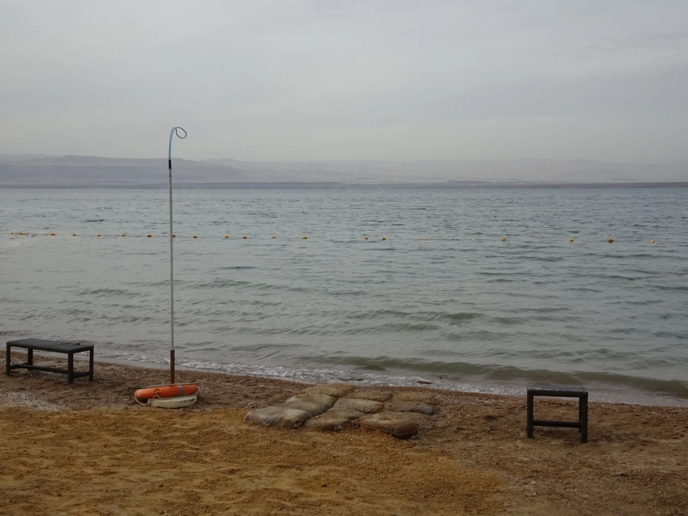 Once down on the “beach” - I use the word advisedly, because the shores of the Dead Sea are not really sandy and all of this has been brought in - I was happy to see two very attentive staff members there on duty, taking good care of everyone - particularly the children who came down to test the water. When one fell over and got water in his eyes, they were right there with an eyewash, plenty of drinking water and a soft towel.