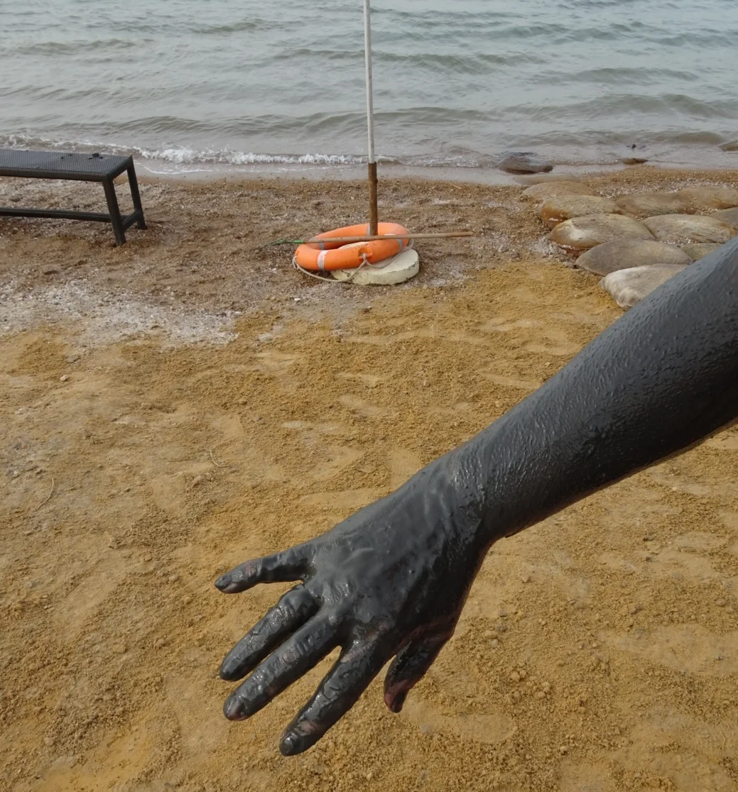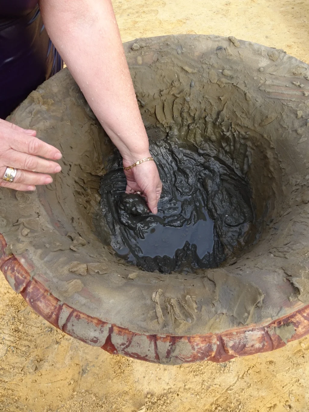 Nest step, then, was to get a handful of mud. Black, slightly sticky and a bit lumpy, it proved quite difficult to cover our whole bodies - certainly, we helped with plastering each other’s backs and only when I reviewed the photos did I spot the bits we missed!