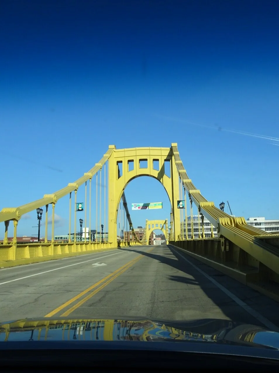 Once we’d escaped the canyon of buildings by the hotel, we were in glorious sunshine, just like the other morning and the bright yellow Seventh St Bridge - the Andy Warhol Bridge - looked great against the blue sky. I loved seeing the reflection in the bonnet of the car too.