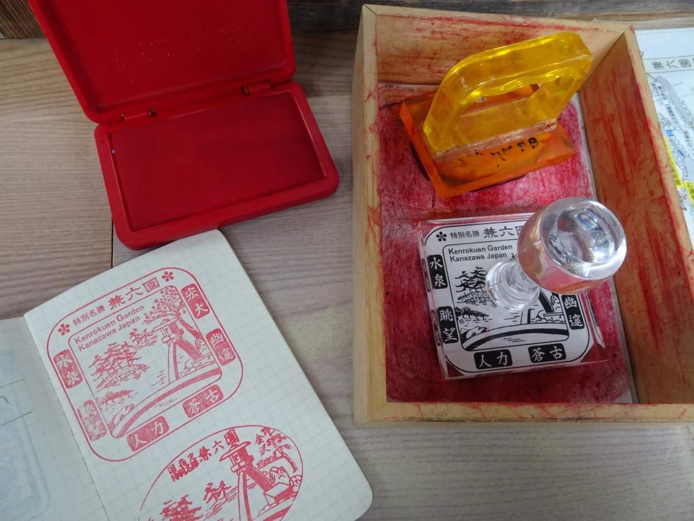 We enjoyed a break under the canopy of the souvenir stand/vending machine cafe and chatted about returning to the station. Did I have time to ask about a rubber stamp? Of course… As we passed the small information kiosk I retrieved my notebook and pointed to the stamp from the station this morning, The young woman nodded excitedly, “Hai!” (yes!) and fished out a small basket from under her counter.