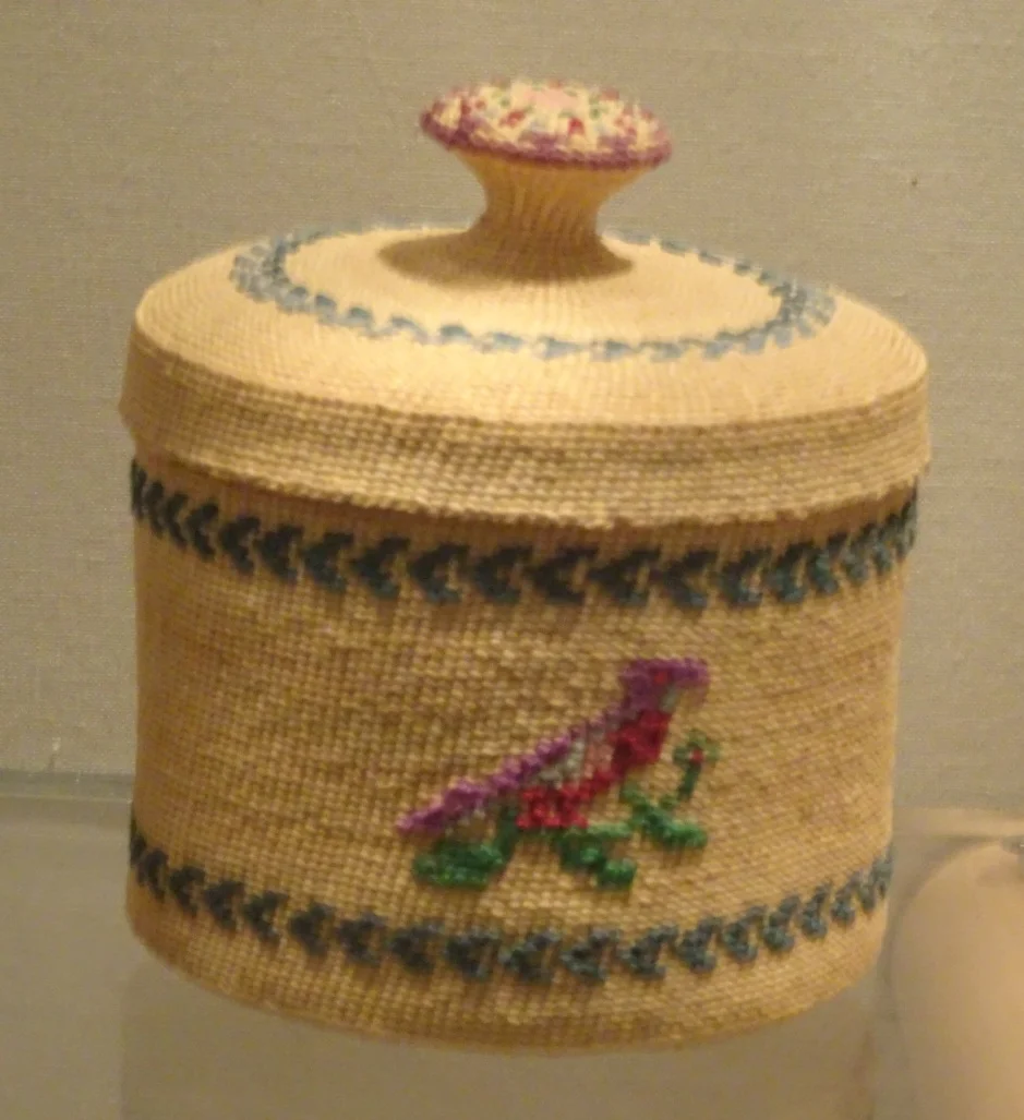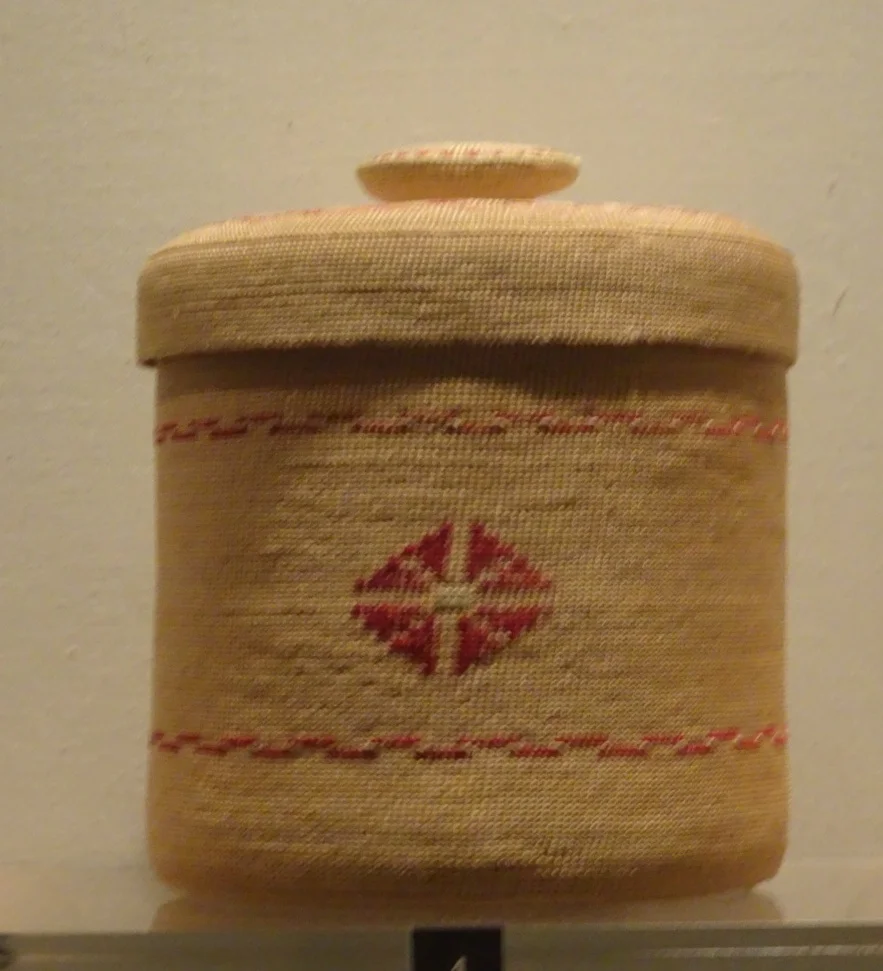 These Aleut baskets are a long standing traditional craft in the islands. They’re woven over wooden formers, to keep them circular and created using local grasses, which can lead to variations in colour. The grasses themselves take much preparation - selection and careful trimming before drying and treating is all part of the skill, though some of the more modern baskets were made from raffia. Some have embroidery thread woven into them to create patterns (the coloured thread would have been obtained by trading), others have the motif “stitched” in afterwards. Most have well fitting lids with elaborately shaped knobs, some reflecting the Russian heritage/trading relationship.