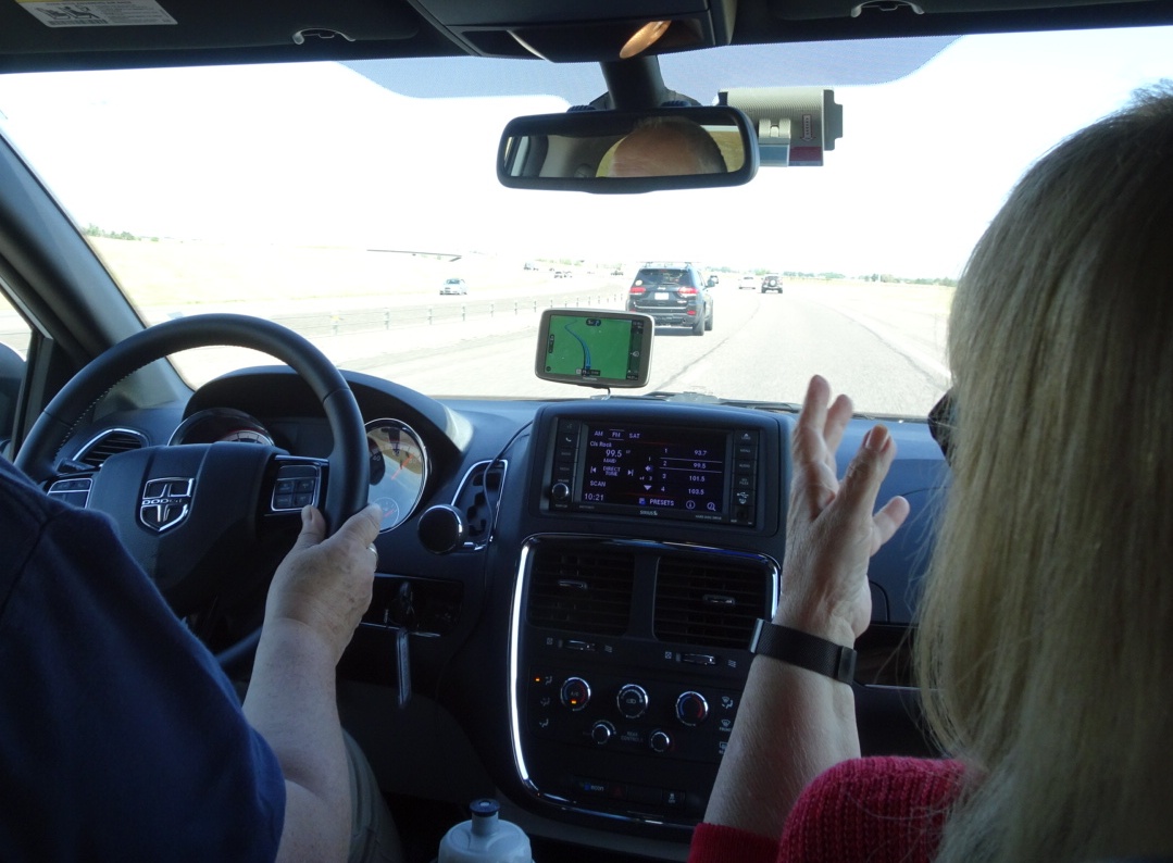 We set off from Denver this morning, my Hero having picked up our rental car - a white Dodge with 5000 miles or so on the clock and minimal chips in the paintwork to photograph! We took up our usual places, I got the knitting out and off we went - the start of the 2019 Road Trip!