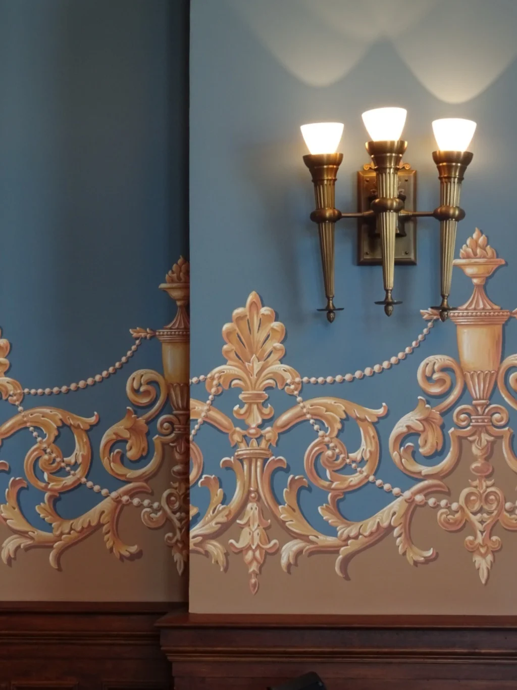 The small details in the decor were admirable, with a fresh, contemporary approach to traditional decor. So all the wall borders and friezes had been handpainted to original designs. Beautiful.