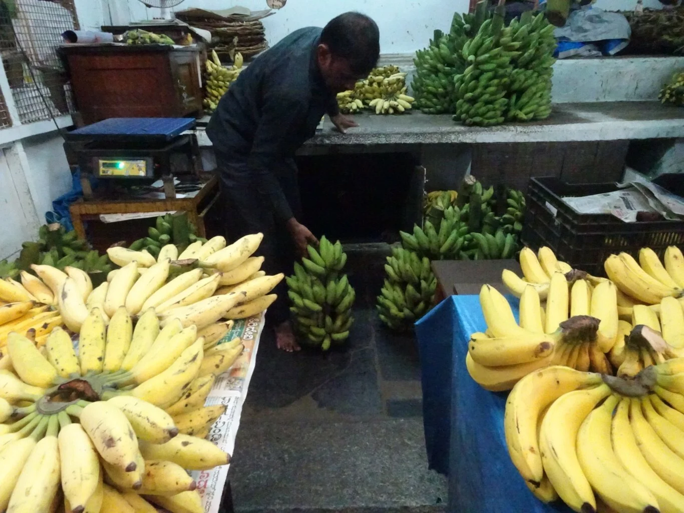 As was the product in the next row: bananas. Not just any bananas, however, these were a particular variety local to the area and known as the Mysuru banana. Small and really sweet, we were grateful to Nagendra for a sample!