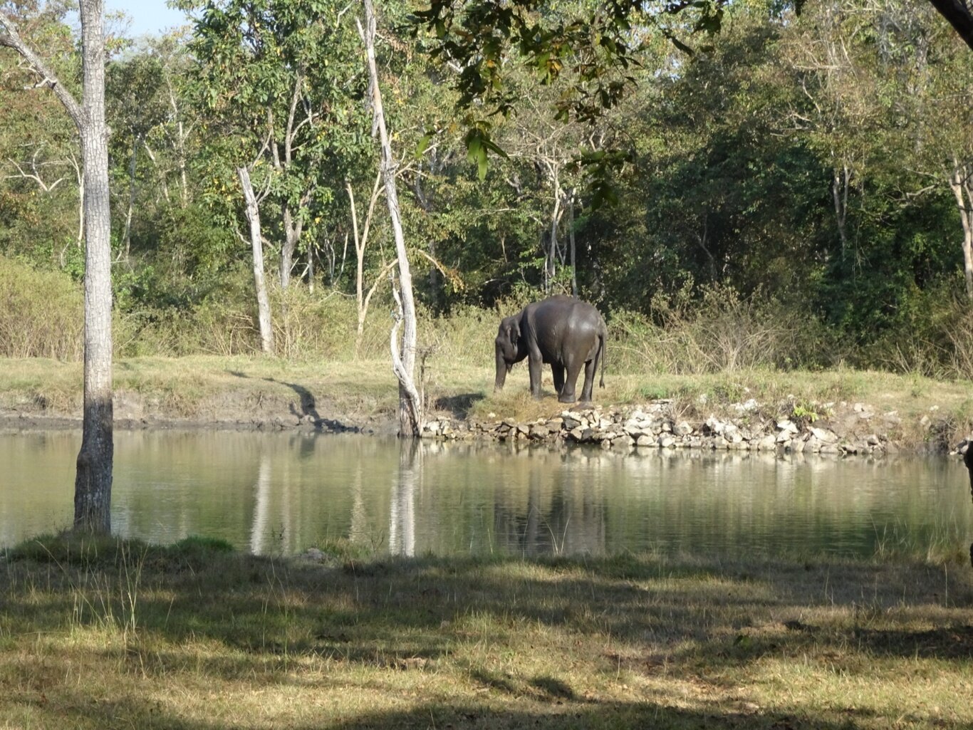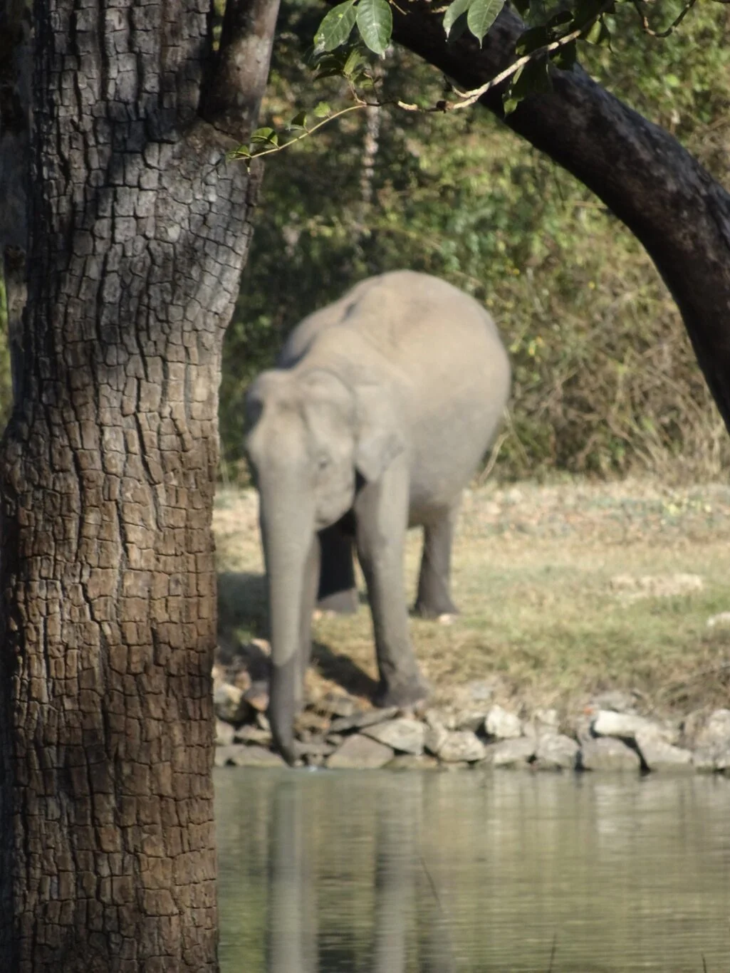 Sure enough, there they were. A pair of elephants standing on the other side of the water. One was giving himself a mudbath from a small puddle he was standing in. The other drank from the waterhole and seemed perfectly at ease.
