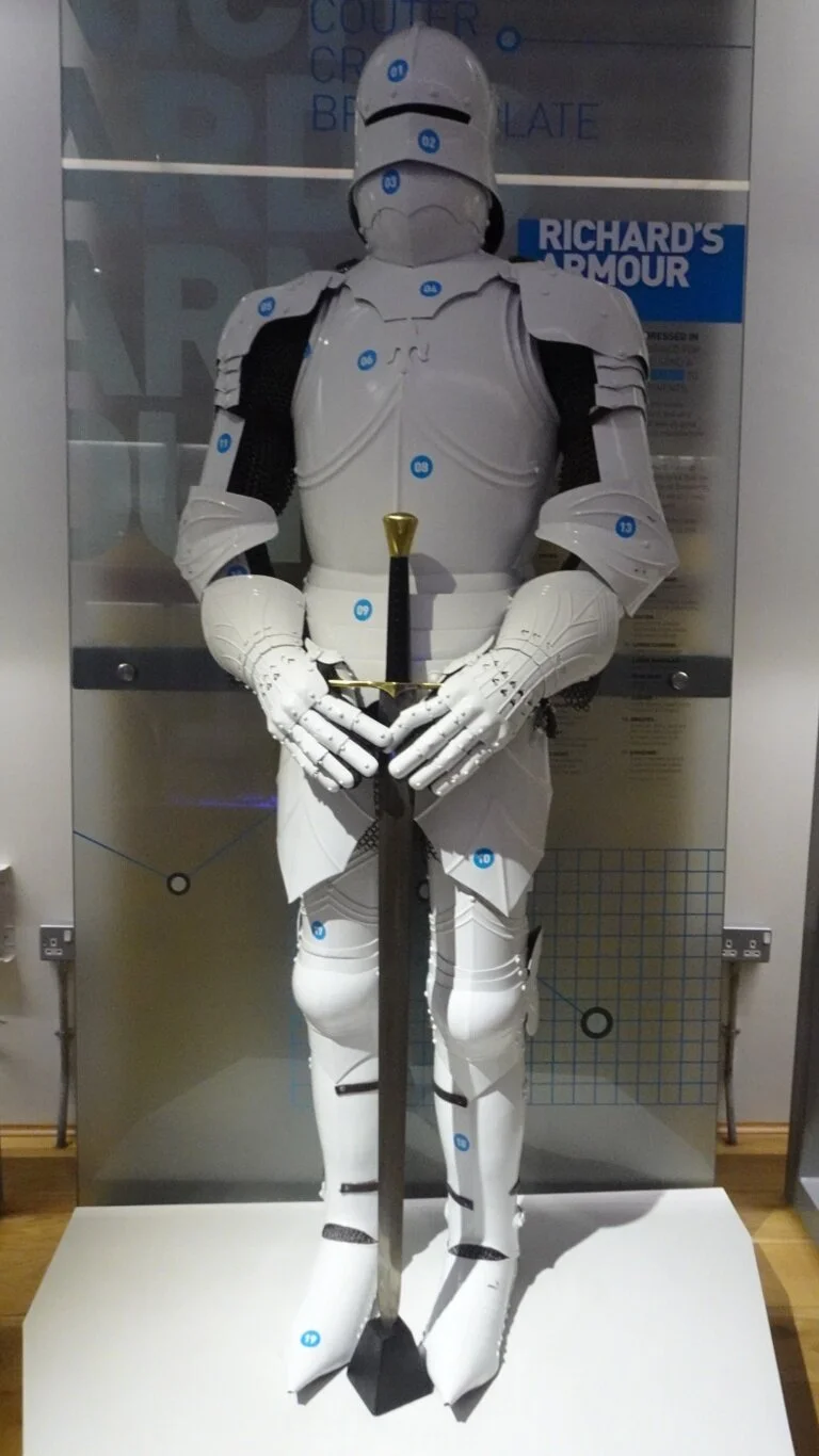 Now I was a bit sceptical of the next bit: the application of contemporary science to what was known. However, the modern demonstration of Richard III’s armour was fascinating, especially as it showed the vocabulary applied to fifteenth century armour. Tassets, voiders or greaves anyone? That this particular exhibit resembled a 15th century stormtrooper was beside the point…