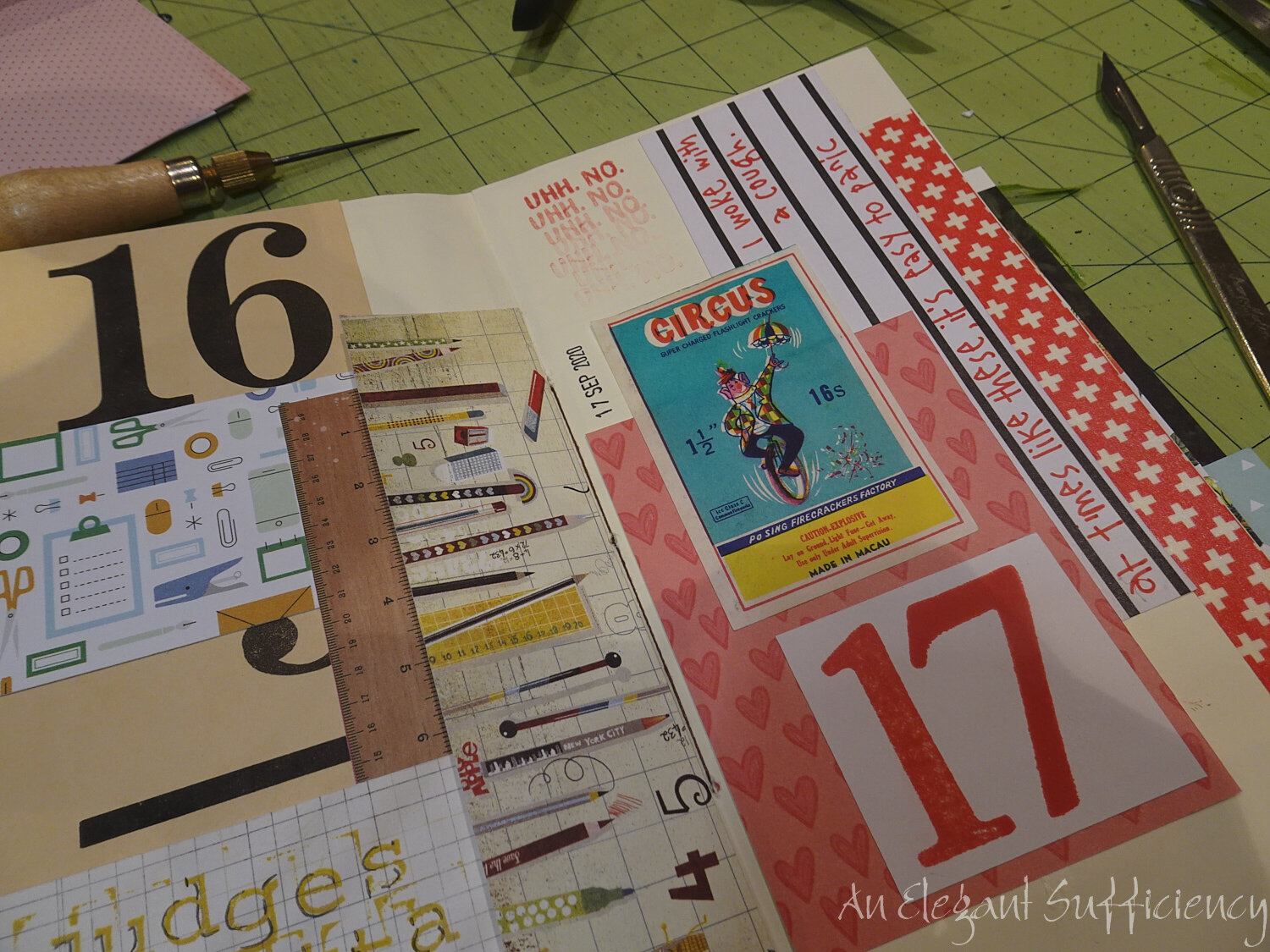It doesn’t matter though. This is my book, no-one is going to check it or tell me it’s wrong and since the main benefit is the therapy of playing with paper, glue and scissors, I’ll put in what I like! My main challenge was the format. I try to explore a new type of book when I do this project and in previous years have done all kinds of journals using hand made envelopes, a carrier bag and a handmade binding. That’s part of the fun. This year, I decided to try the Travellers Notebook format, which continues to have an almost cult-like following but which I have always struggled to use. I believe the format is better suited to the Japanese style of tiny writing and vertical columns, whereas I much prefer a landscape format to work with.