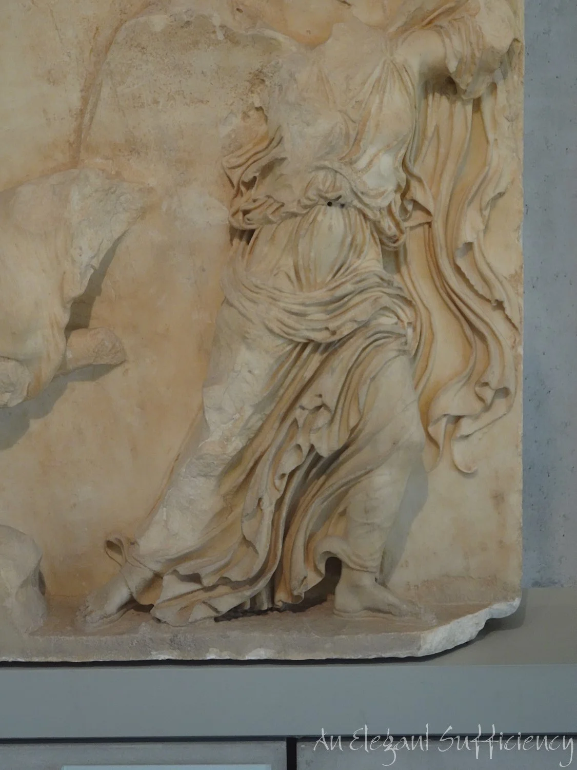 A little further one, we returned to the Temple of Nike again, to see for ourselves a piece of the balustrade Gabrielle had mentioned earlier. The beautiful flowing fabric was highlighted, where considerable skill had been used to create a feeling of movement.