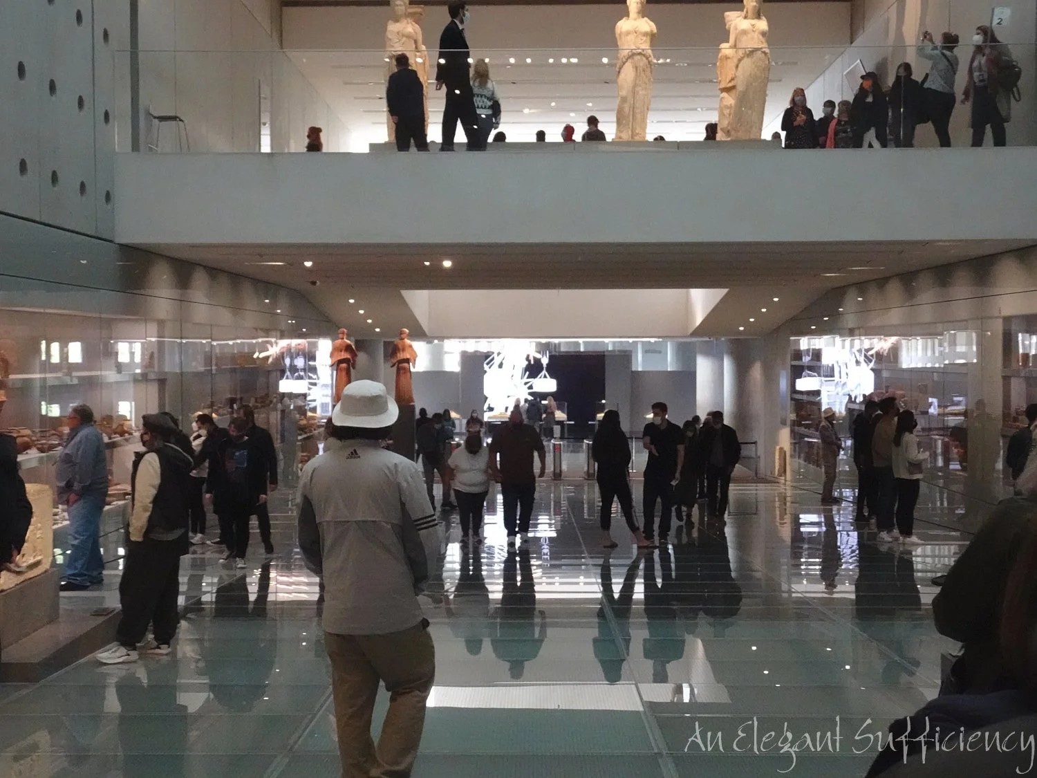 Up to the top floor then, into the glass area which we’d seen earlier, set at an angle. The whole floor was a replica of the Parthenon itself, with the columns supporting the carved stone panels. Some of these were original, others gypsum replicas.