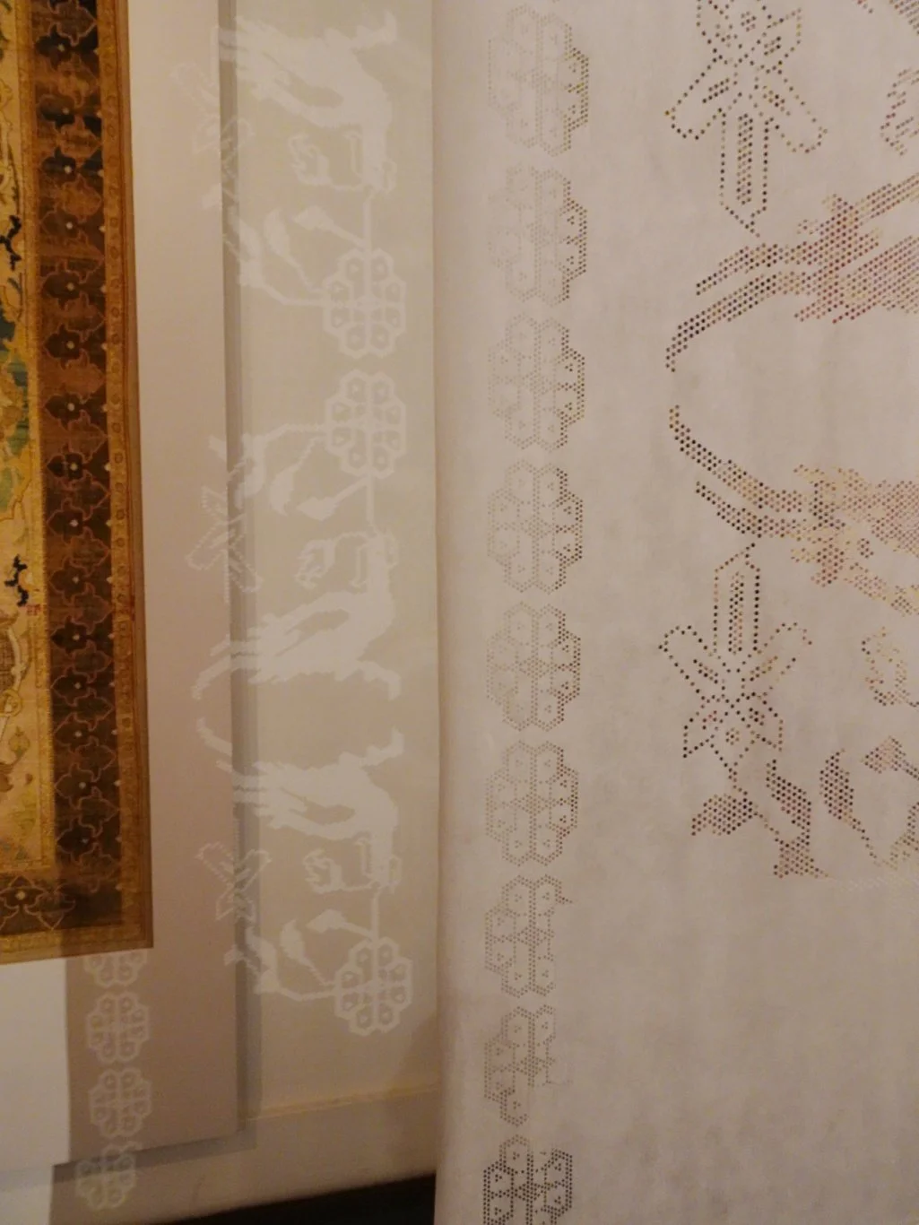 There are fine collections of carpets here, rooms filled with colour and texture and I feel that I should learn more about them. Instead, I find my attention caught by the way the punched paper patterns hanging from the ceiling throw a shadow onto the wall…