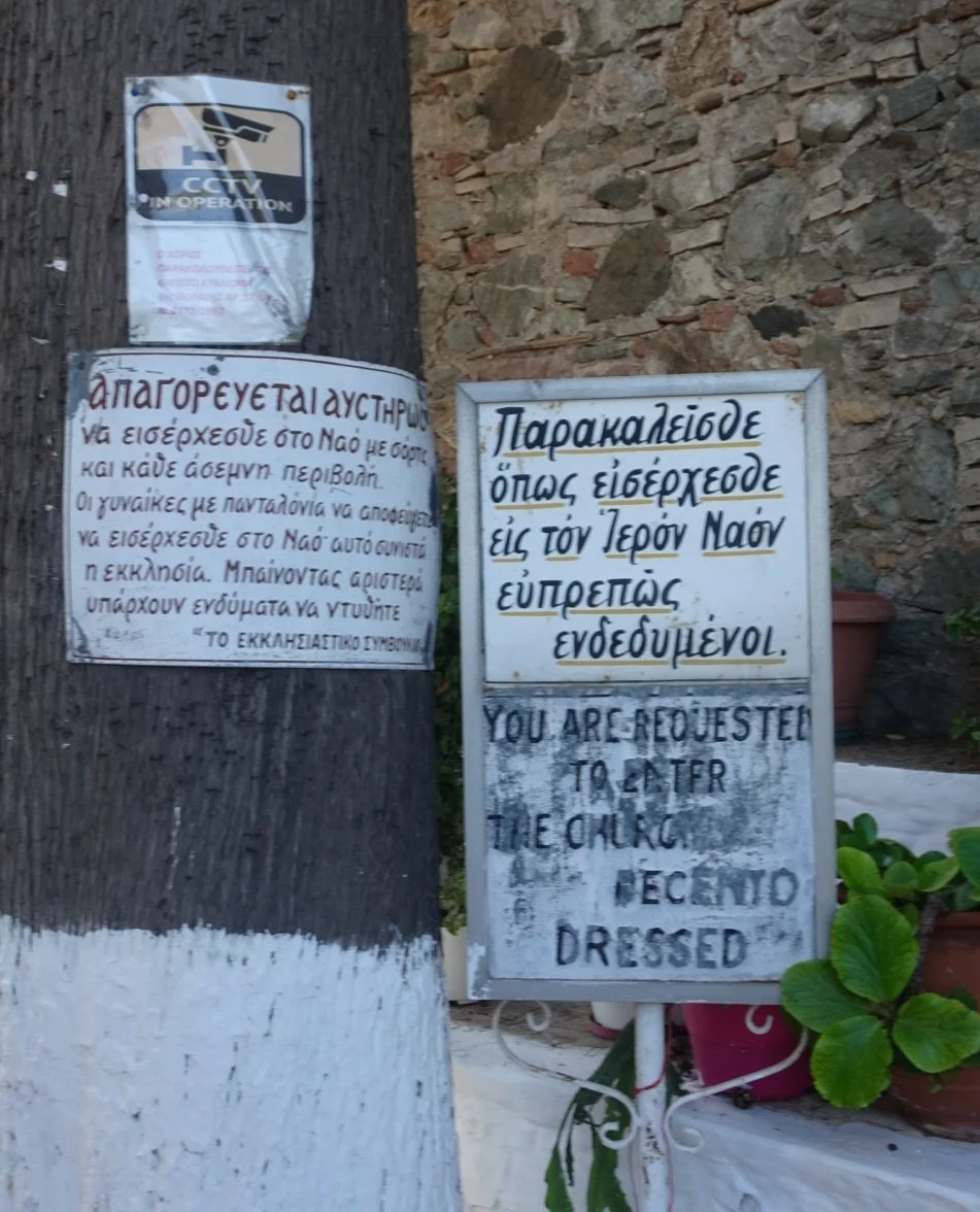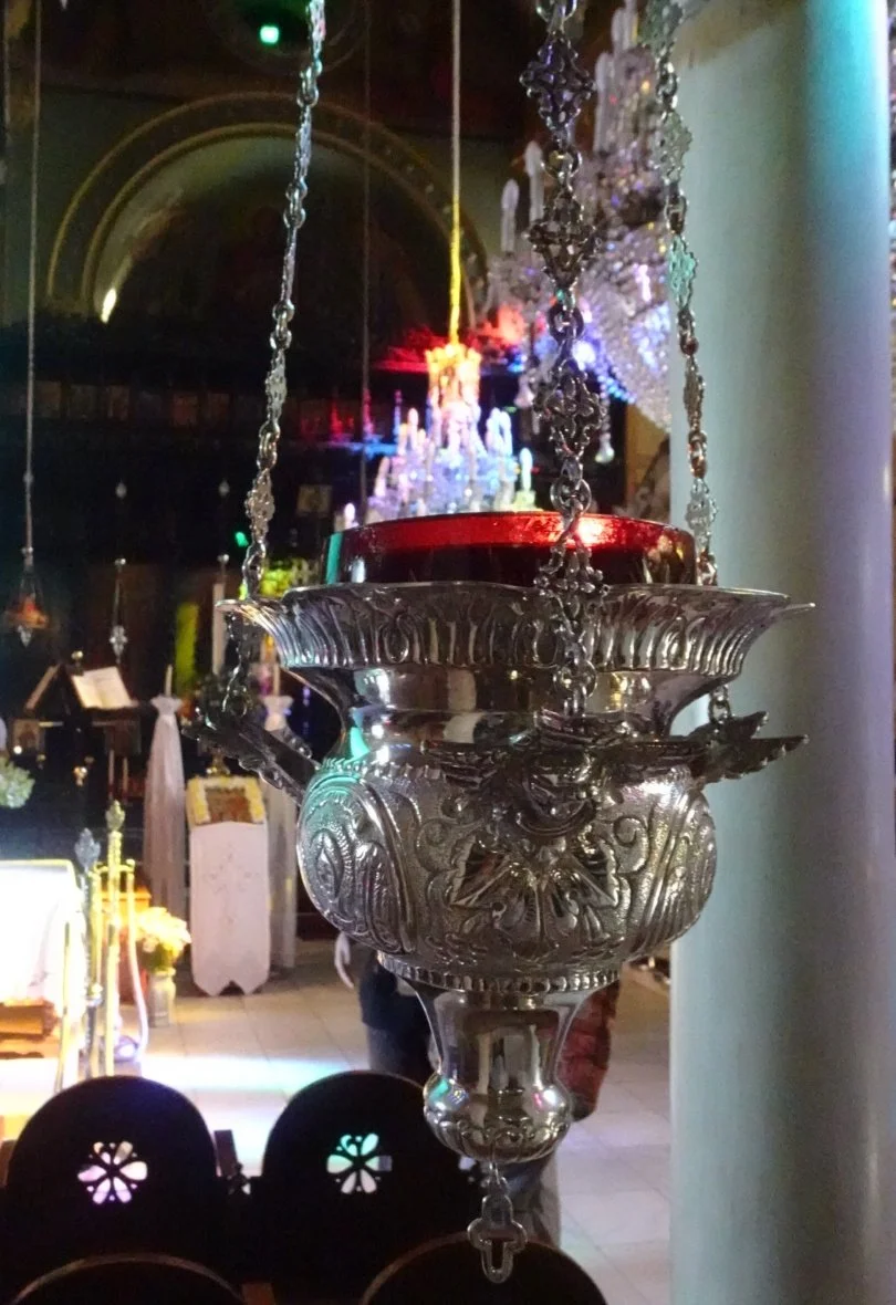 We would have missed that small, fascinating detail had Dina not pointed it out however. There, at the foot of one of the columns by the iconostasis was a flower arrangement and a pair of shoes. Actually, there were two pairs of shoes - the other pair is in the feature photograph for this blog post. They are there according to a peculiarly Lesbos tradition, associated with the Archangel Michael who is believed to make occasional visits during the night. Being an angel, he doesn’t have the power to walk, but by leaving a pair of shoes for him, he can move a little further. Dina added that the priest has confirmed that on occasion, he has noticed that the shoes have been worn…