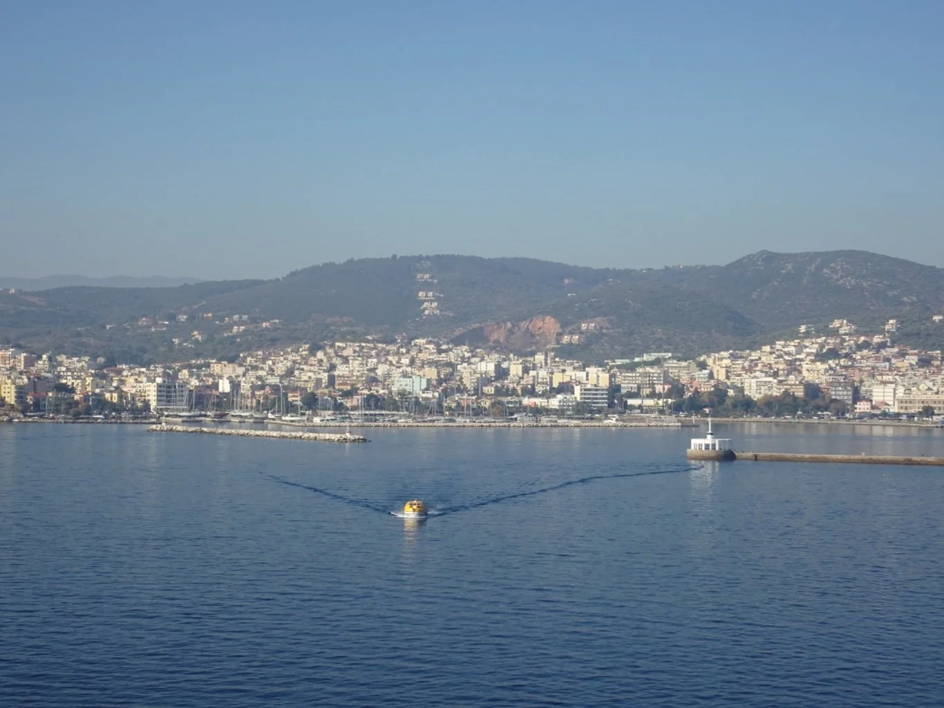 It was a classic on board view. Just there on the horizon, about five miles away we’re told, is Turkey and presumably, the island of Bozcaada, where we were originally expecting to call. But something cropped up and a last minute change of itinerary had us heading for Lesbos instead, with a hasty change of tour plans.