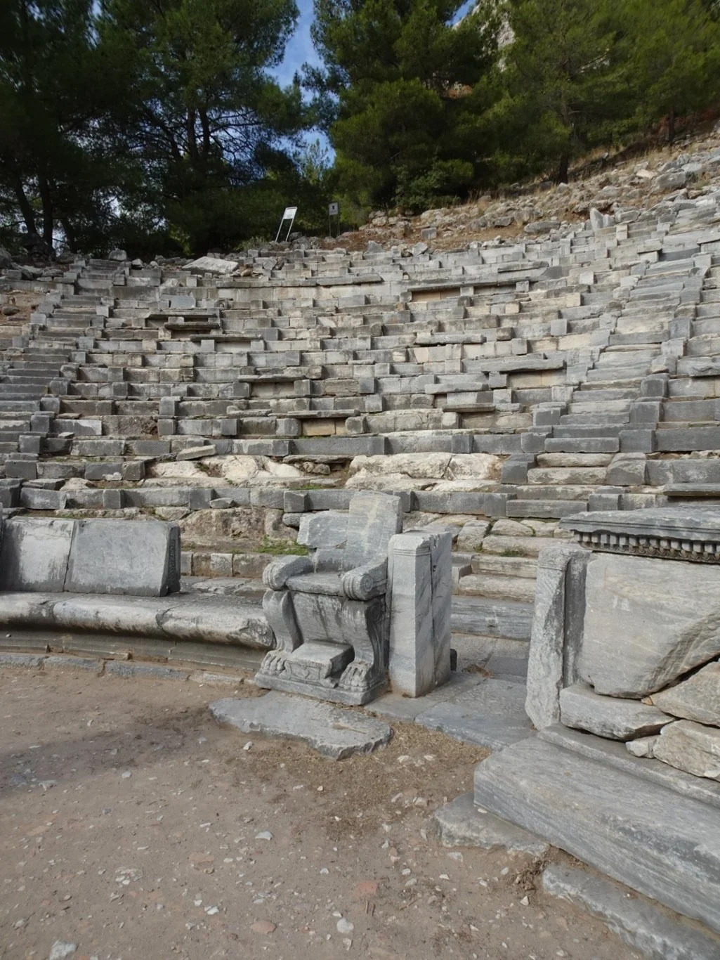 We walked around the perimeter of the theatre, admiring the views of the mostly unexcavated city here. Ahmet pointed out the bath house, just across the way and showed us where a ten mile ceremonial way had led to Didyma, the place where citizens would go to consult the Oracle. Beyond that, the other parts of the city await discovery (and funding!)