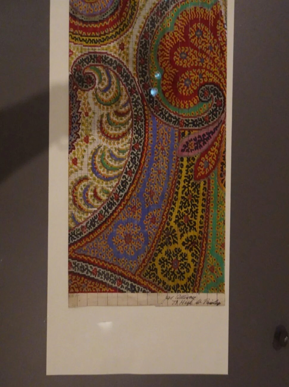I took many photos but will share just a couple of favourites, the first one being a design for a paisley shawl. Shown flat in a glass cabinet this exquisitely coloured sample proved impossible to photograph without a shadow or a reflection. A couple of the real things were hanging close by and though I took pictures of each, the reflections are dreadful!