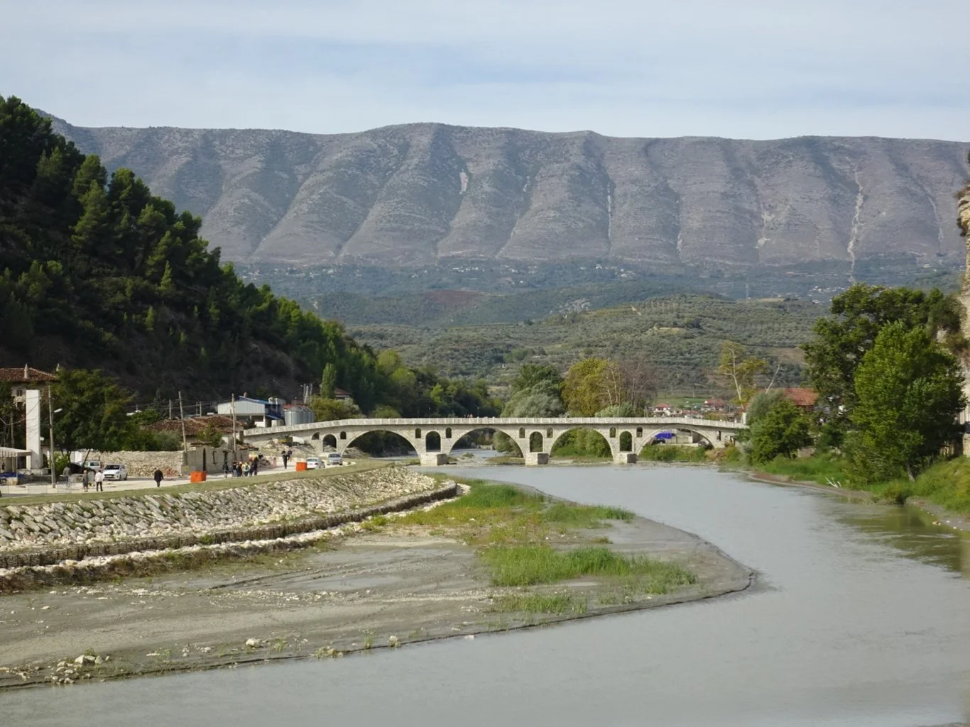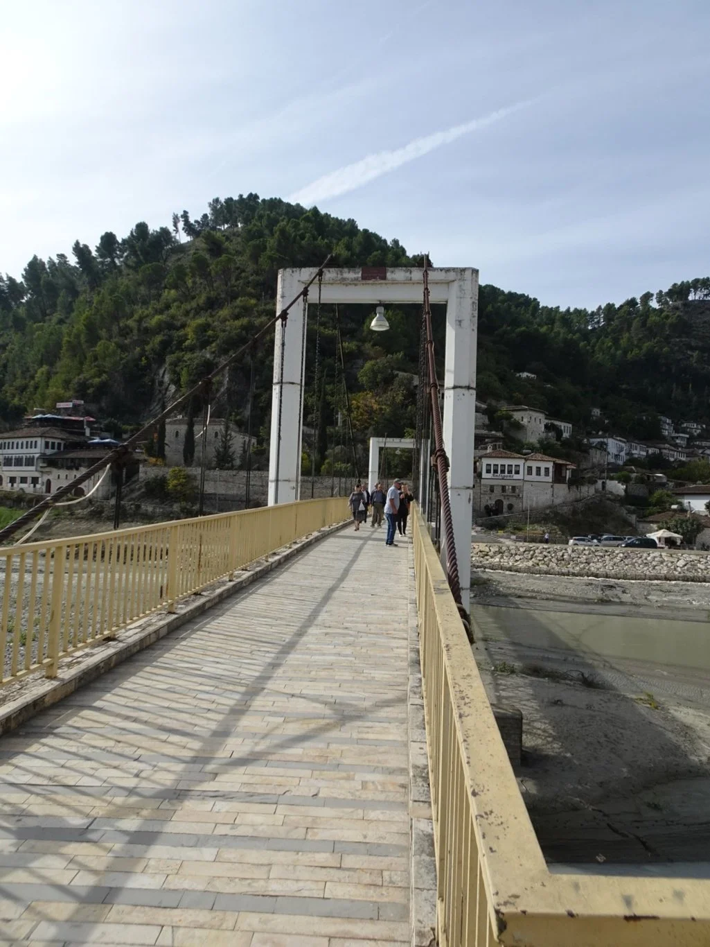On we walked then, towards our meeting point. We took Ilir’s advice and stepped onto the suspension bridge over the river to get a good view of the old stone bridge a little further downstream.