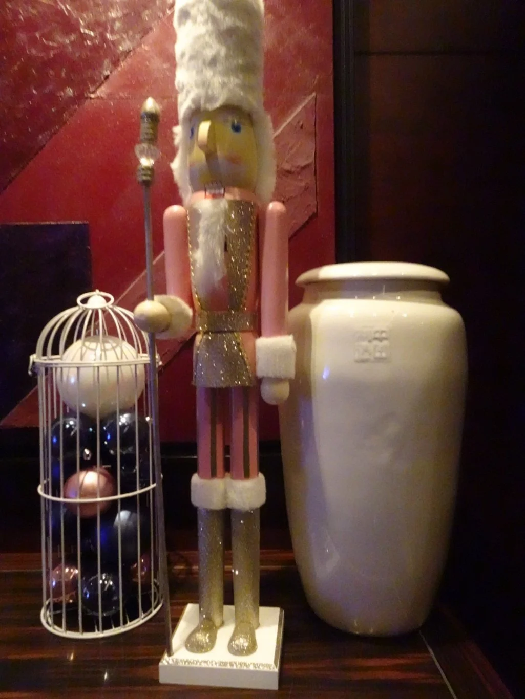 The first thing we noticed upon checking into our hotel was that Christmas has arrived. Already. The foyer is populated with pink-clothed nutcrackers and collections of pink and navy blue baubles in birdcages.