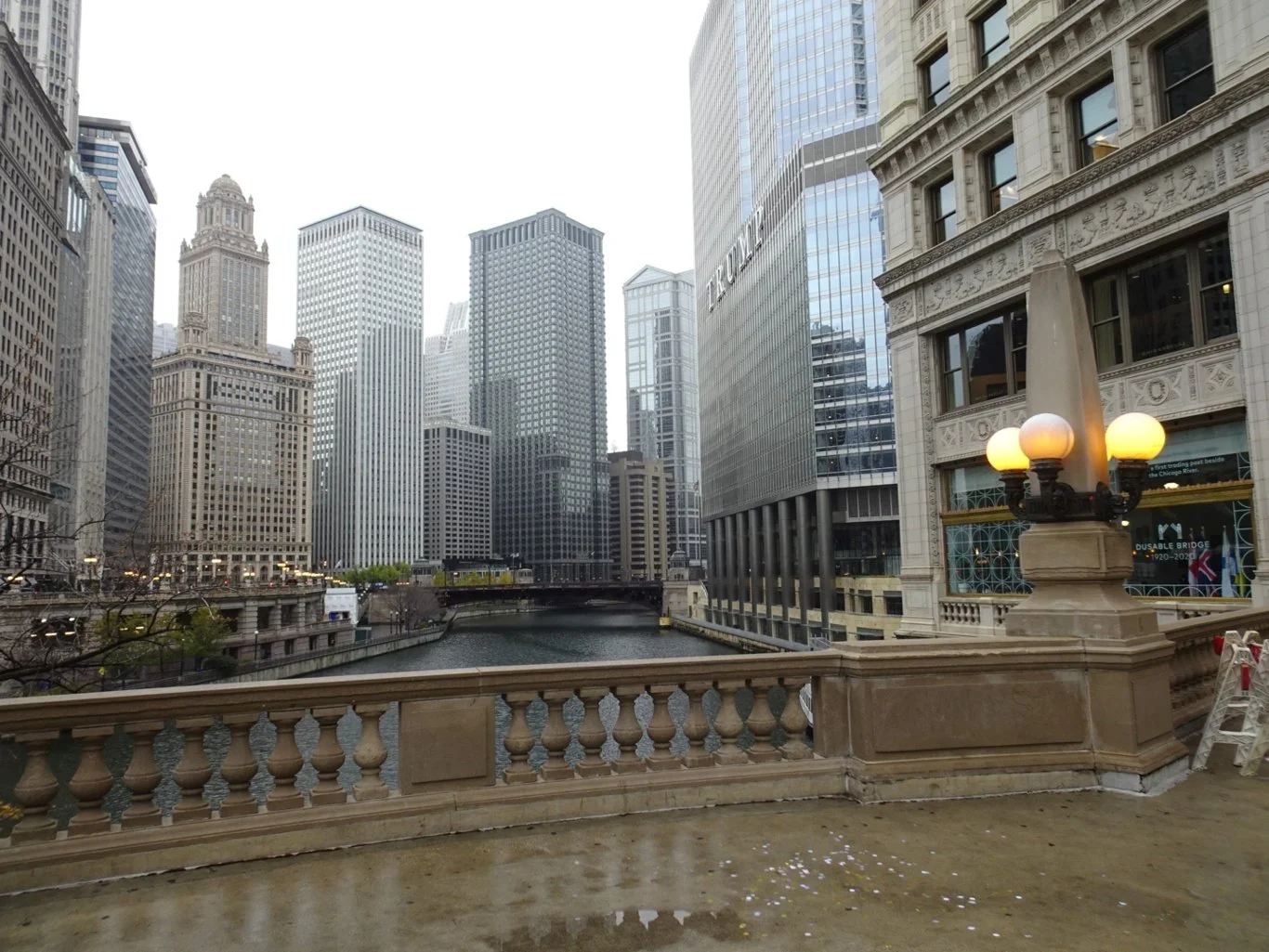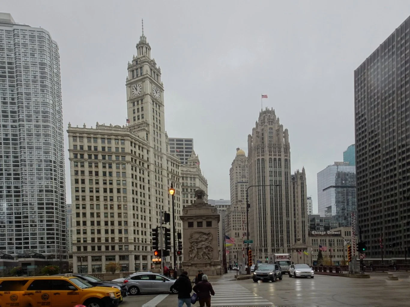 This is a great collection of buildings though: the tall clock tower is part of the Wrigley building and across the road, the other large tower is the Chicago Tribune .