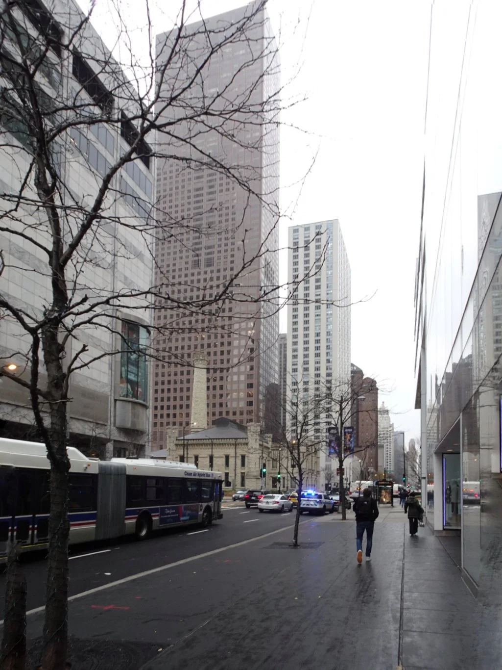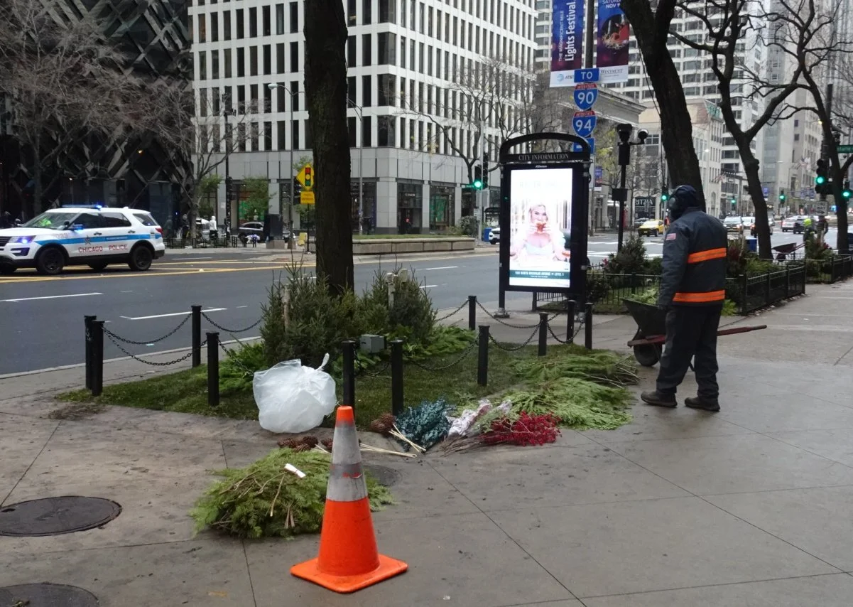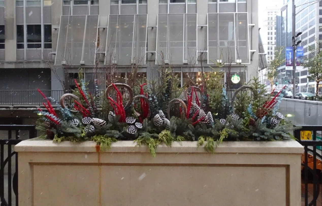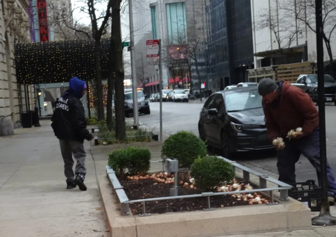 Setting off down Chestnut Street an hour or so later with the intention of spending a few hours along Michigan Avenue, we noticed a team working in the cold sleety rain, refreshing the flower beds along the street.