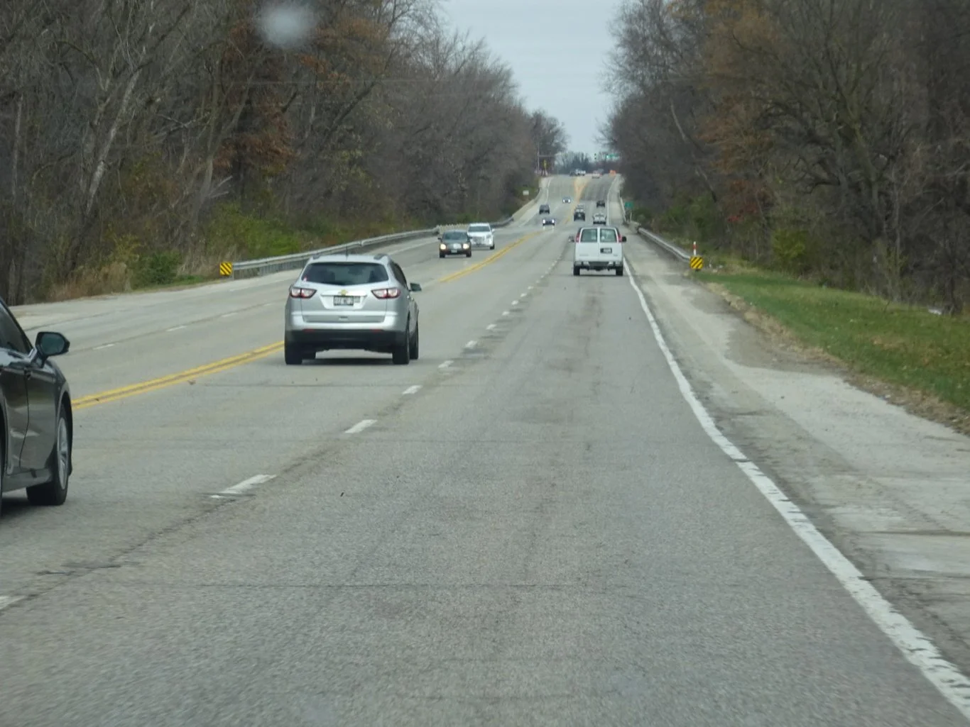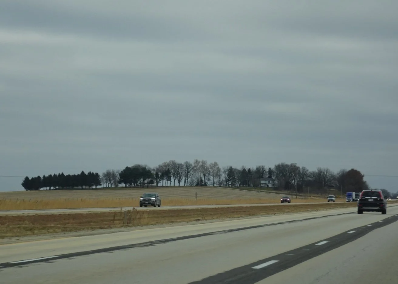 We noted small features along the way and on more than one occasion I tried (and failed) to capture the Route 66 roadsign, for this freeway was built along part of the old road. I liked the arrangement of trees on the hillside opposite, possibly the only hillside for miles around! My word, the wind must whistle around the properties in this part of Illinois.