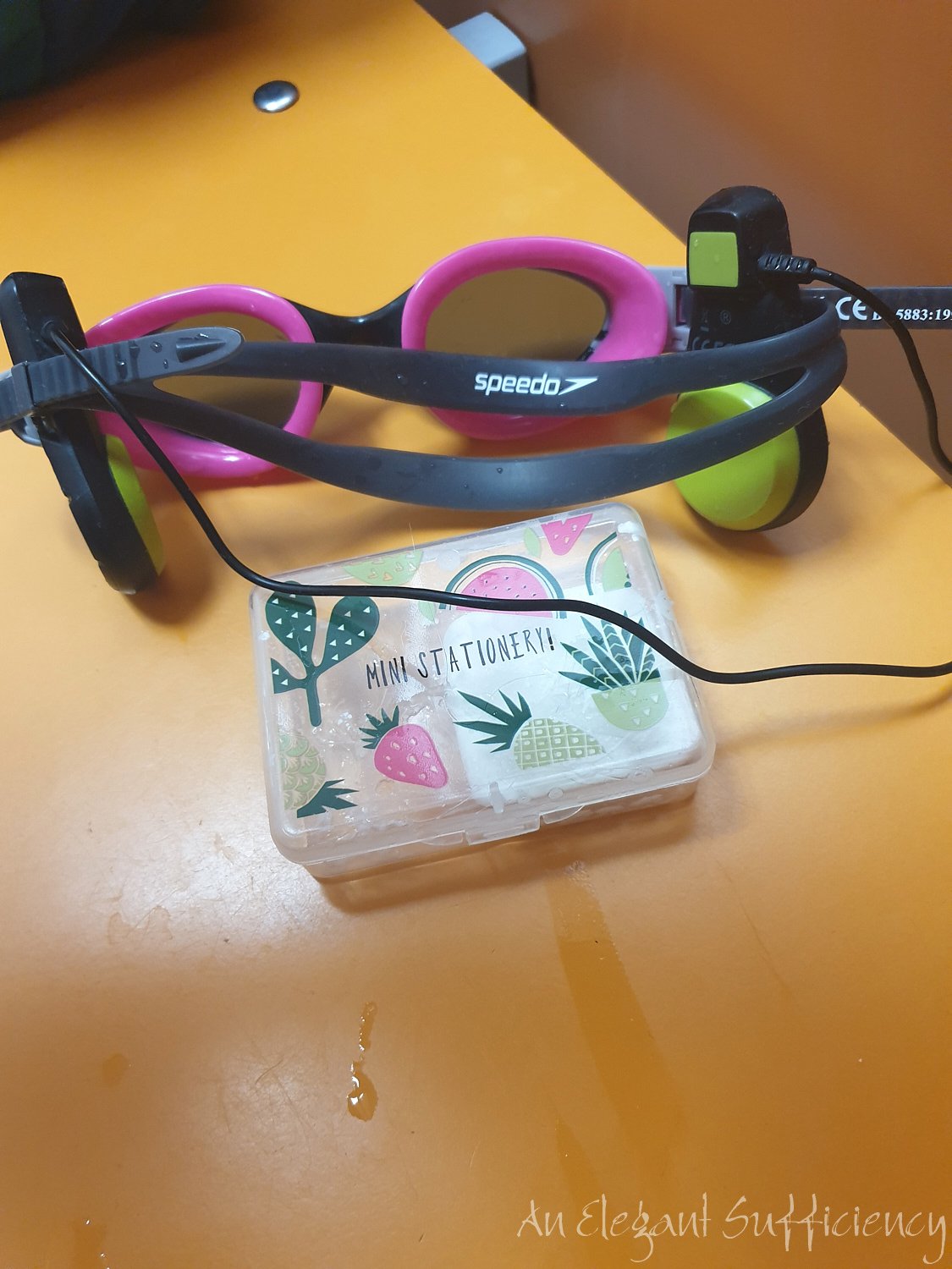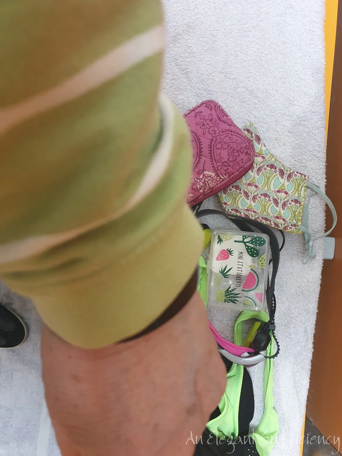 This morning, I was particularly amused by this, so put my swimsuit and goggles onto my towel to take a few photos to share here, minus the orange! My current swimsuit is lime green and black - having replaced the same one in pink and black a few months ago. I always buy the same goggles, choosing pink rather than the blue alternative and was rather pleased to find that the headset I use for my music is lime green and black (no colour choice there, but just a happy accident!)
