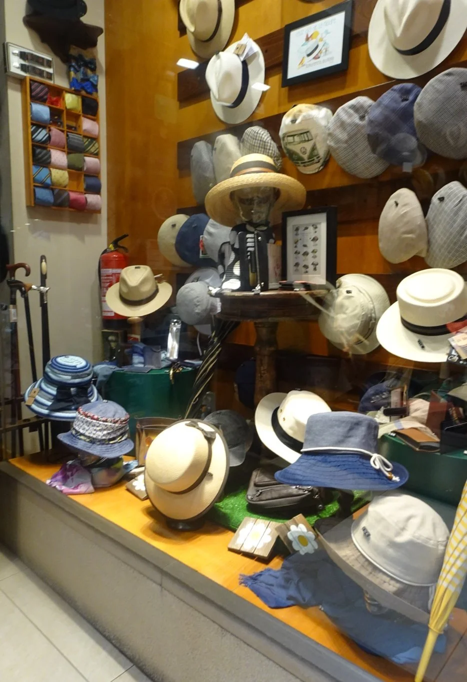 We soon realised that we were on the way to completing a full circle, as we could see the Plaza Mayor just ahead of us, but catching sight of this window of the sombrerería , we were happy to stop and admire the display. I have been admiring so many shop windows here, filled with the most stylish accessories and this was no exception.