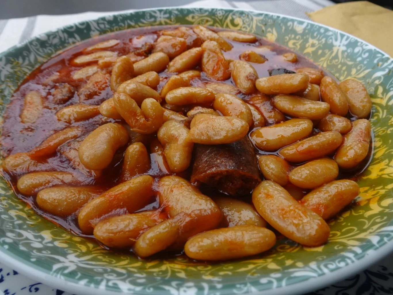 There was, to quote from one of Edward’s favourite storybooks, “a little bracing dampness in the air”, i.e. it felt like rain. We had a table under a decent umbrella though, so were quite comfortable sitting watching people, scribbling a few notes in my book and thinking about plans for the next couple of days. We had asked the young woman who brought our drinks about a table indoors, but the answer was just as expected “fully booked”. However, if we wanted to order food for this outdoor table, that would be fine. We thought about it and around 2.30pm decided that given the circumstances, two bowls of the Asturian speciality of fabada would be perfect.