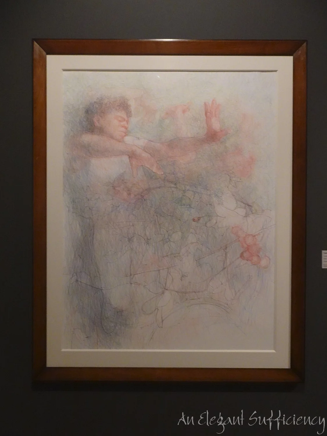 And that was it. Or was it? Wasn’t there something we were going to return to? Well, yes there was. In the first room was a group of works by Curtis Holder, the teacher who had wowed me with his drawings using coloured pencils. I wanted a closer look at those, hopefully without the crowd who were there when we’d arrived.