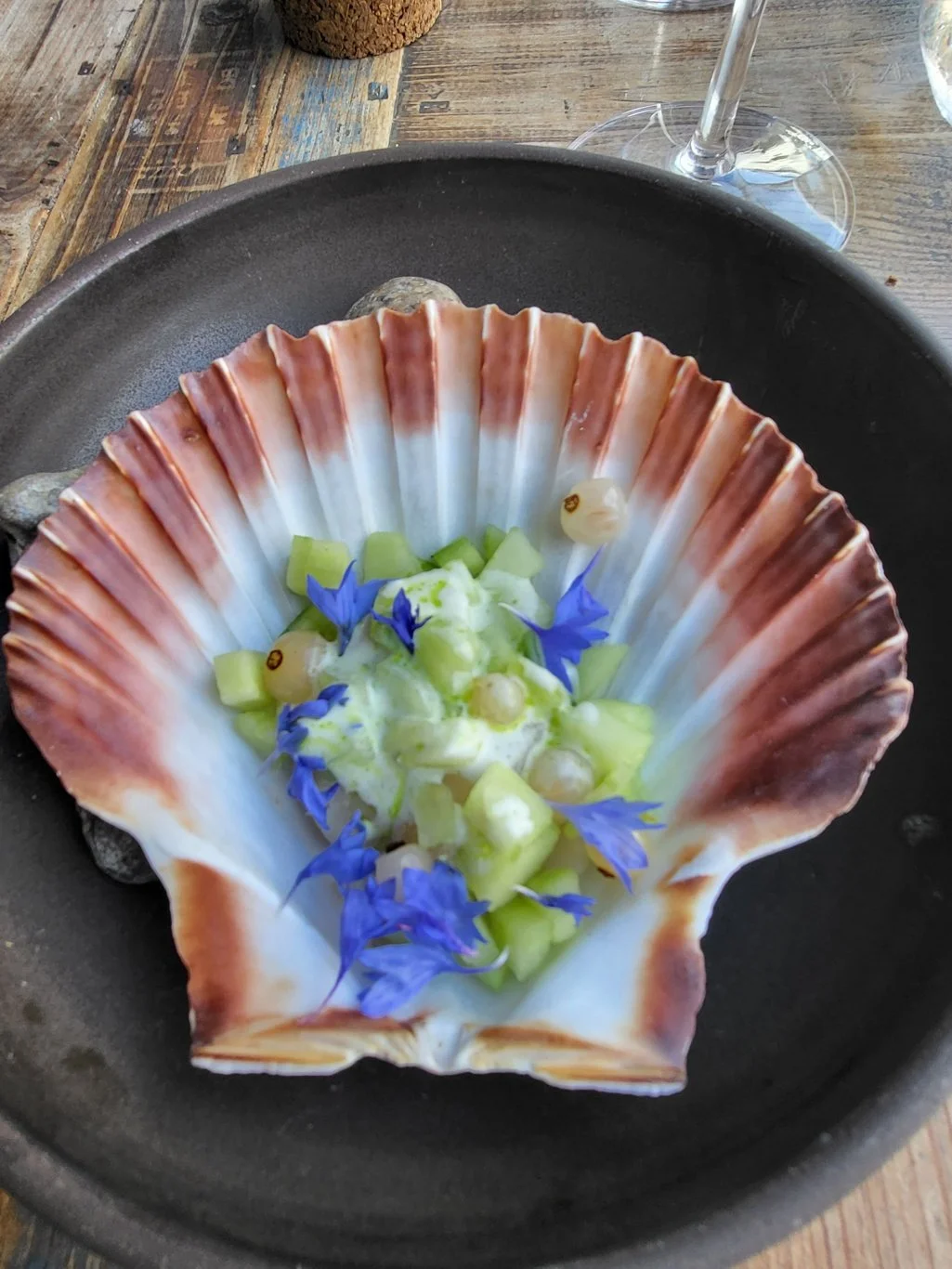 There followed a succession of plates. This one, the scallop dish from the menu just as artfully arranged with fresh sprigs of flowers. In between, though, were small “surprises” which were not on the menu. Two of them, in particular, were especially delicious.