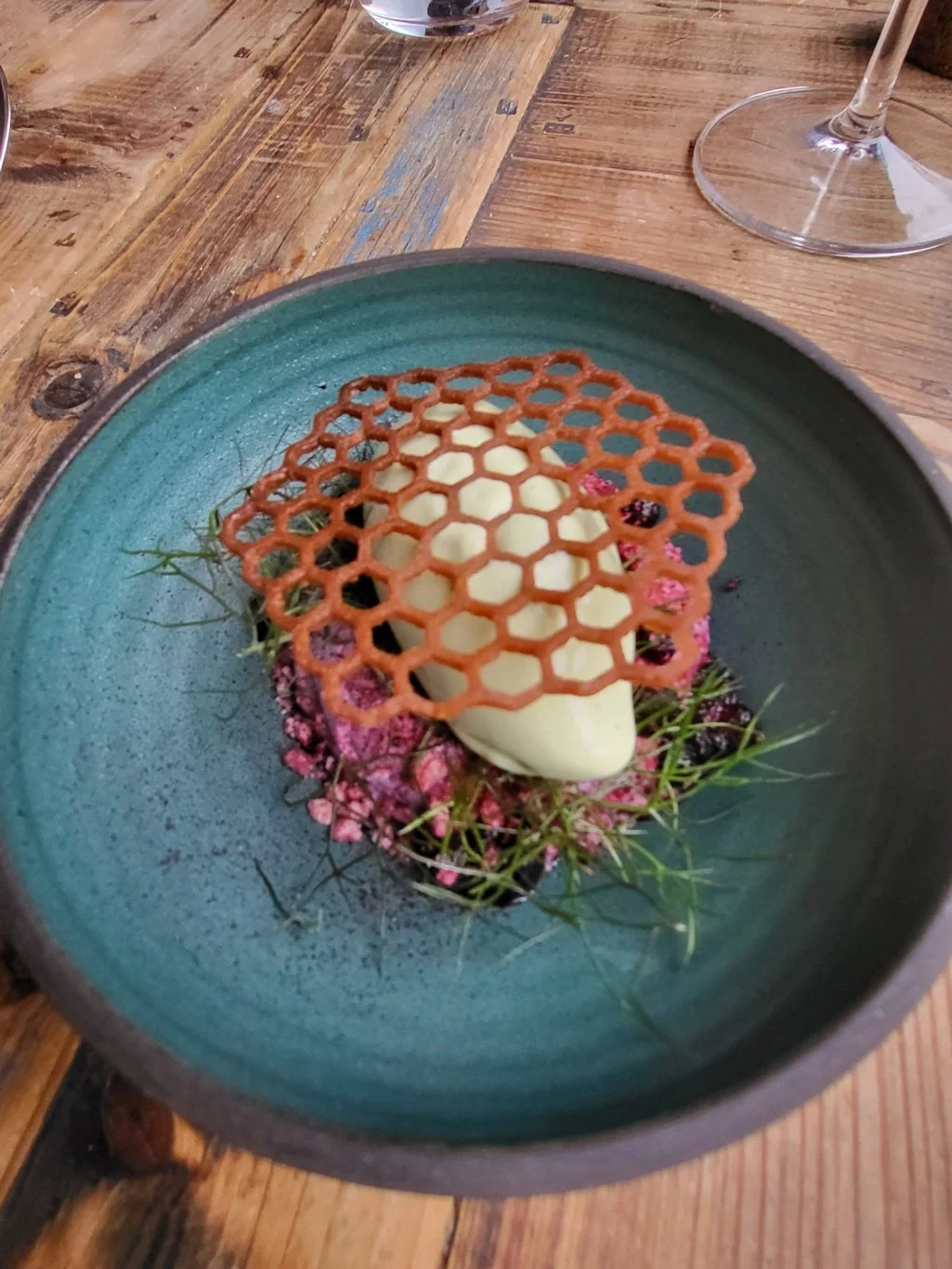 Finally, the blueberry dessert, served with a sparkling red wine, another of the rather different wine pairings which belied the simple descriptions in the menu.